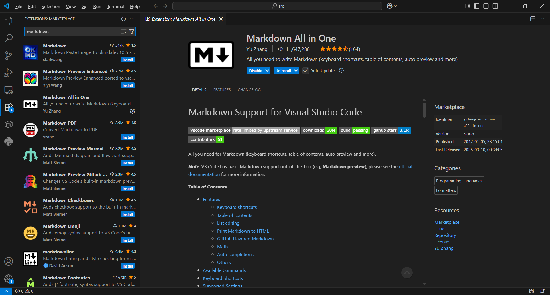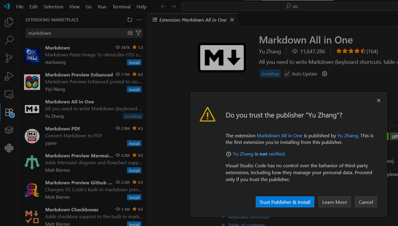 VSCodeを開きExtensionsをクリックしmarkdownと入力します。 Markdown All in Oneの右側にあるInstallをクリックします。