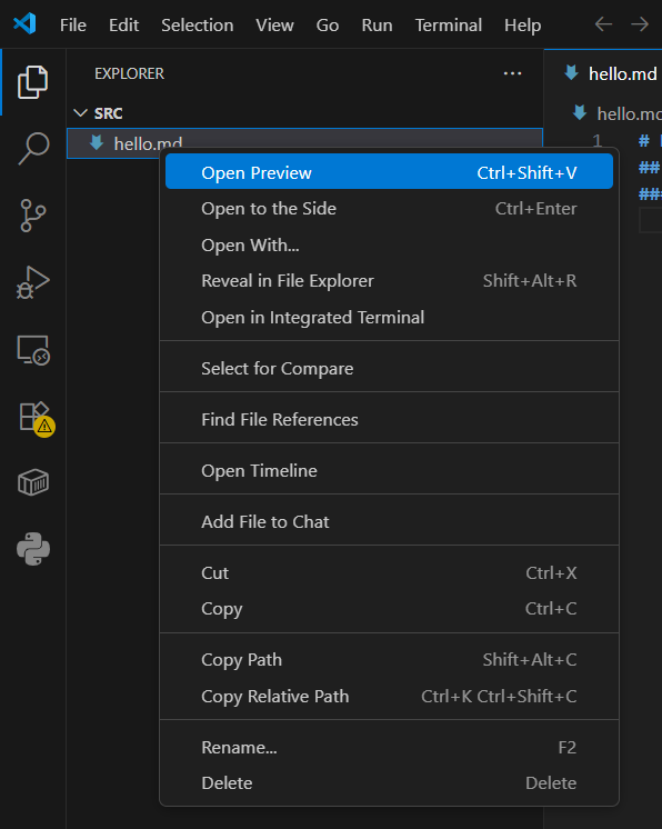 hello.mdファイルを右クリックしOpen Previewをクリックします。