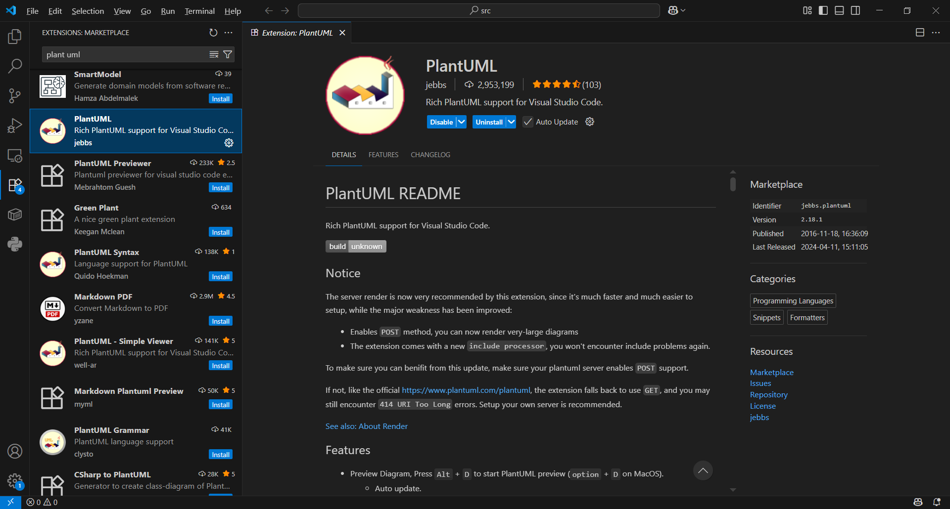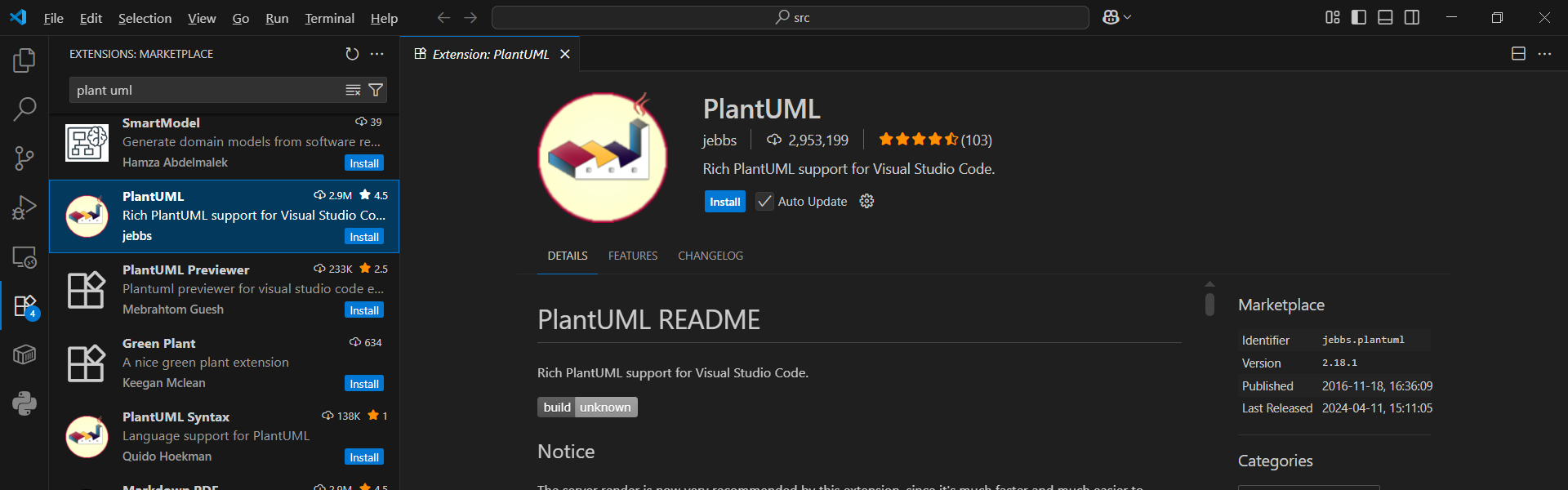 VSCodeを開きExtensionsをクリックしplant umlと入力します。 PlantUMLの右側にあるInstallをクリックします。