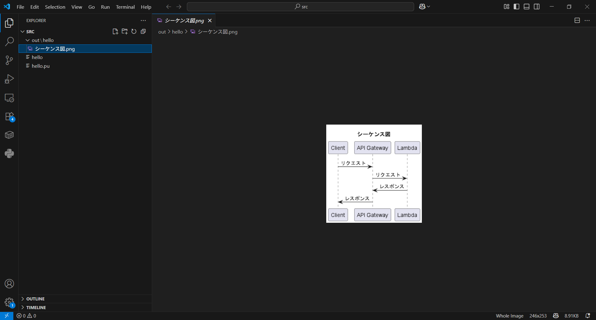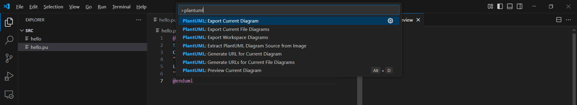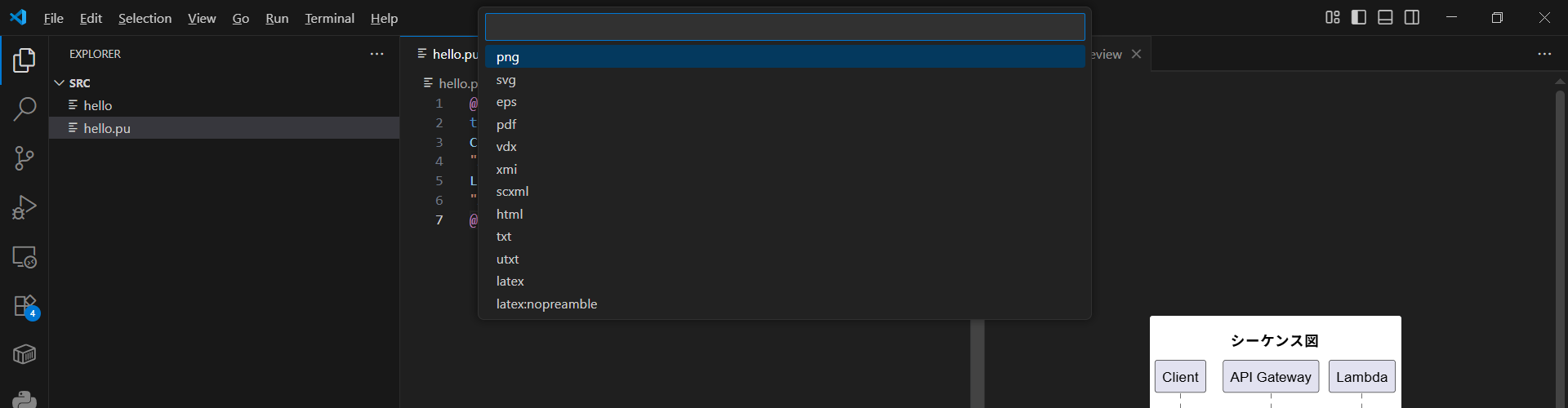 Ctrl+Shift+Pを押しplantumlと入力しPlantUML: Export Current Diagramを選択しEnterを押します。
