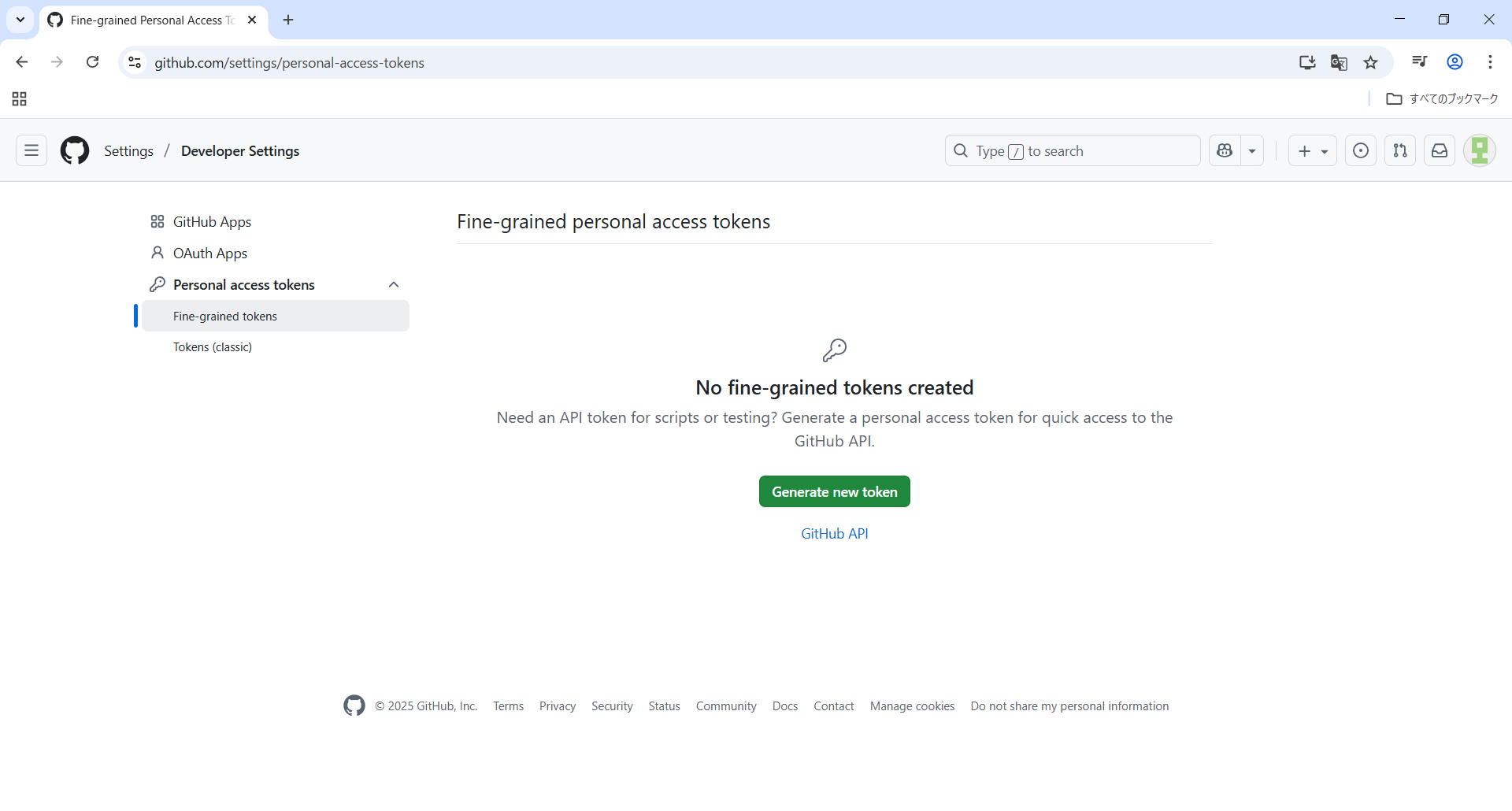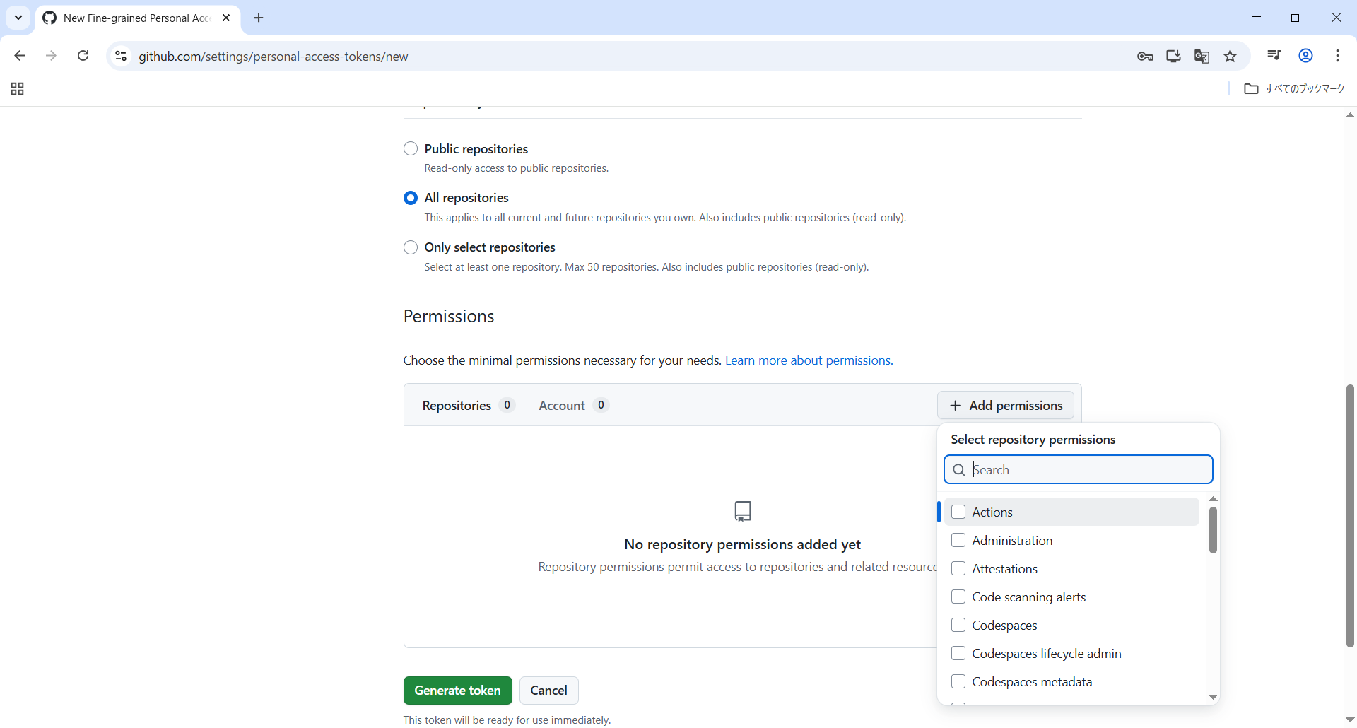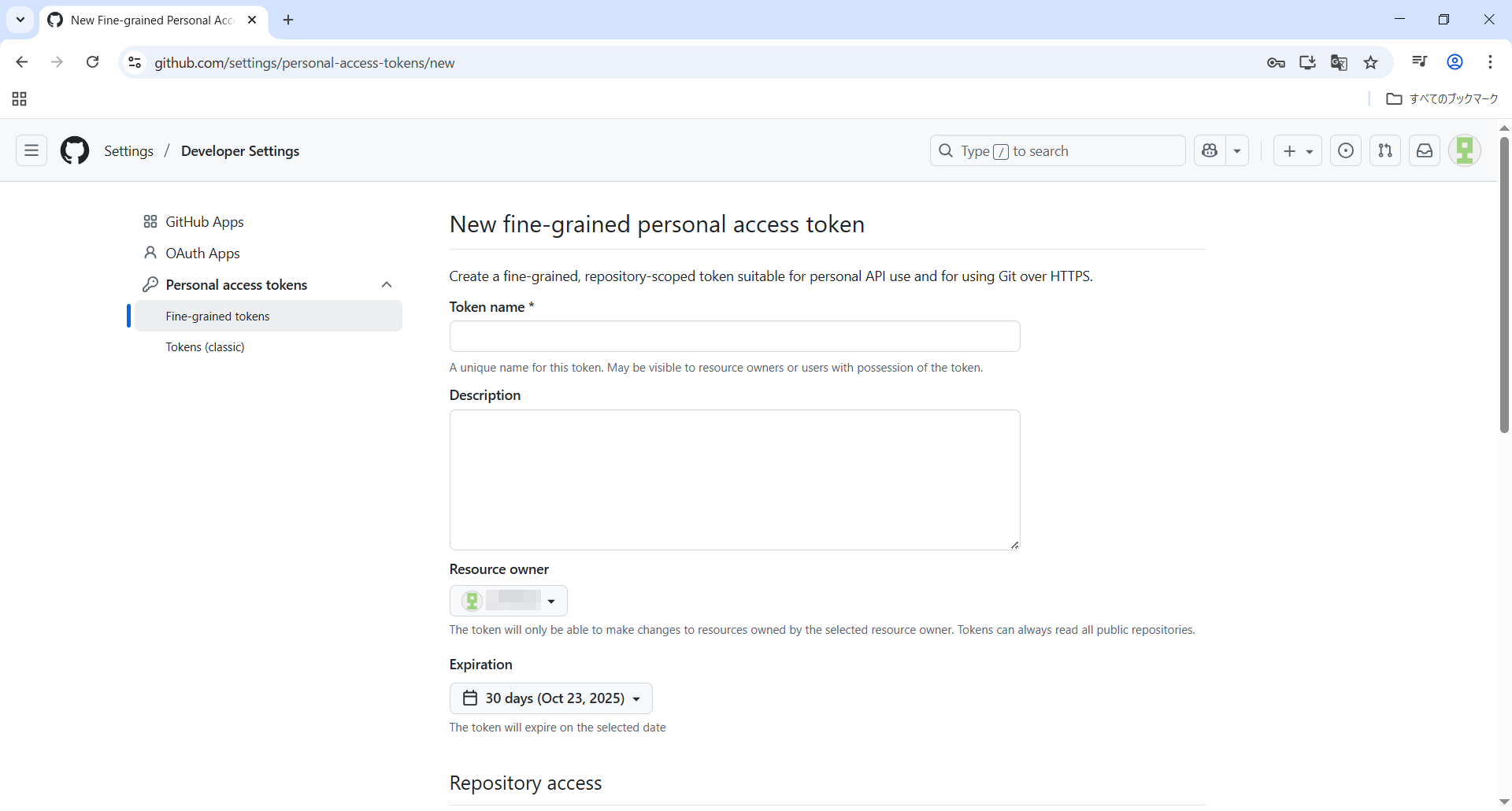 Fine-grained tokensをクリックしGenerate new tokenをクリックします。