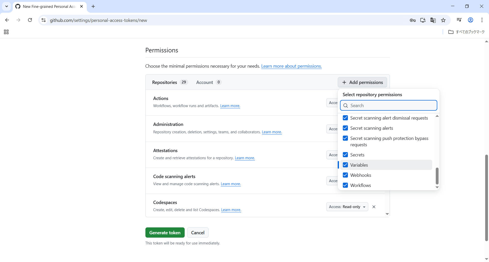 下までスクロールさせて全部チェックしGenerate tokenをクリックします。
