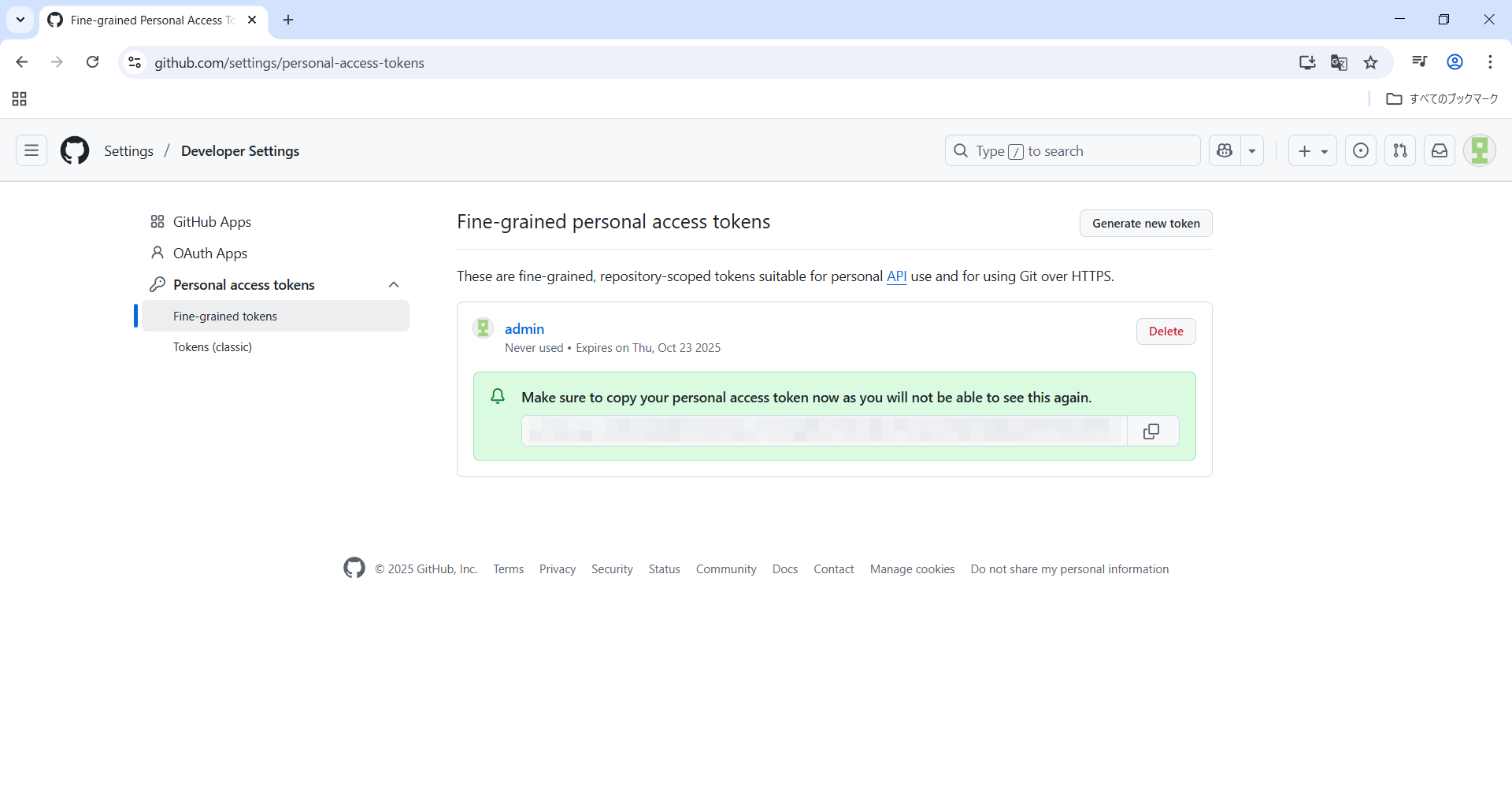 tokenが生成されたのでコピーしておきます。