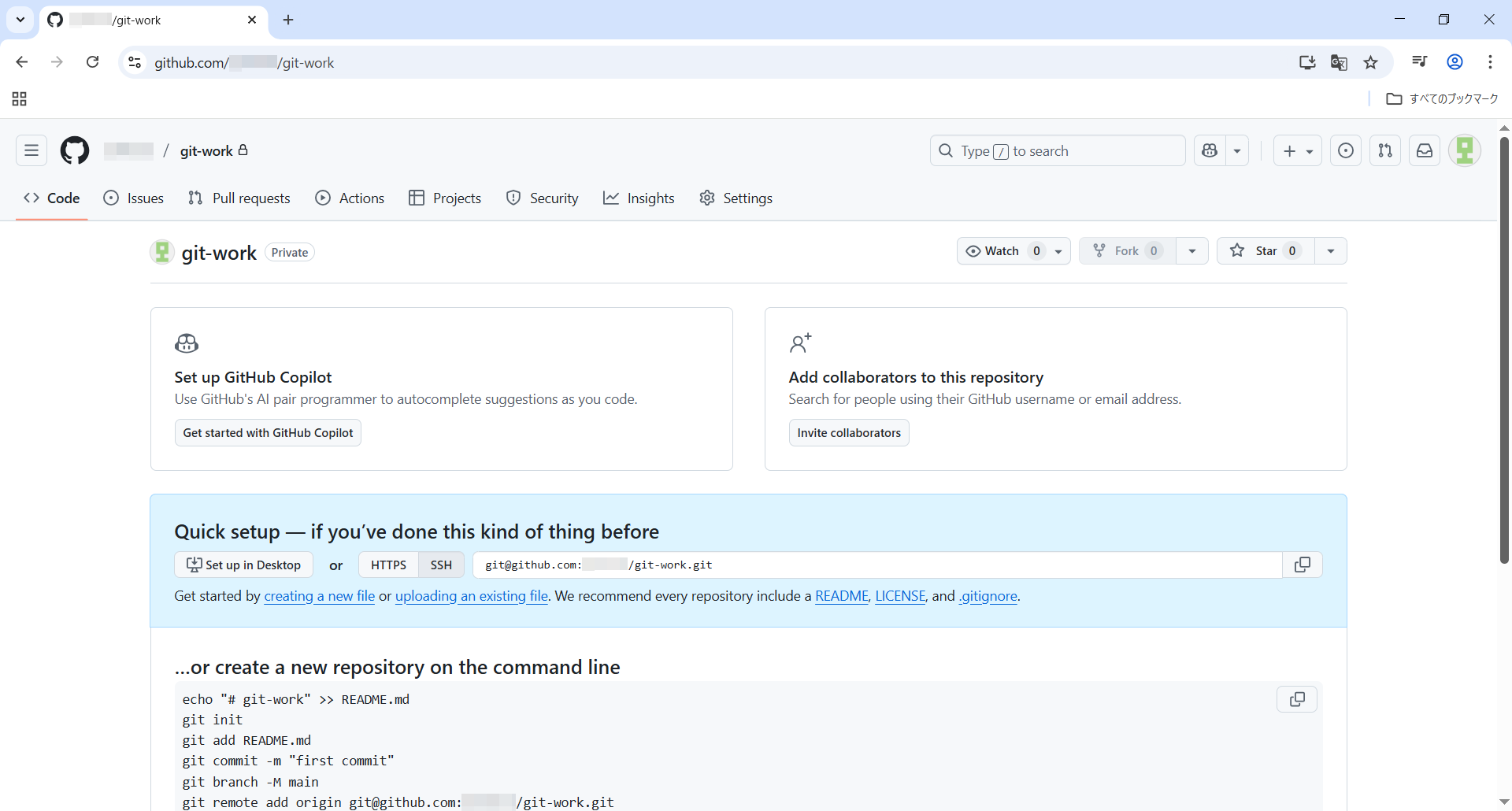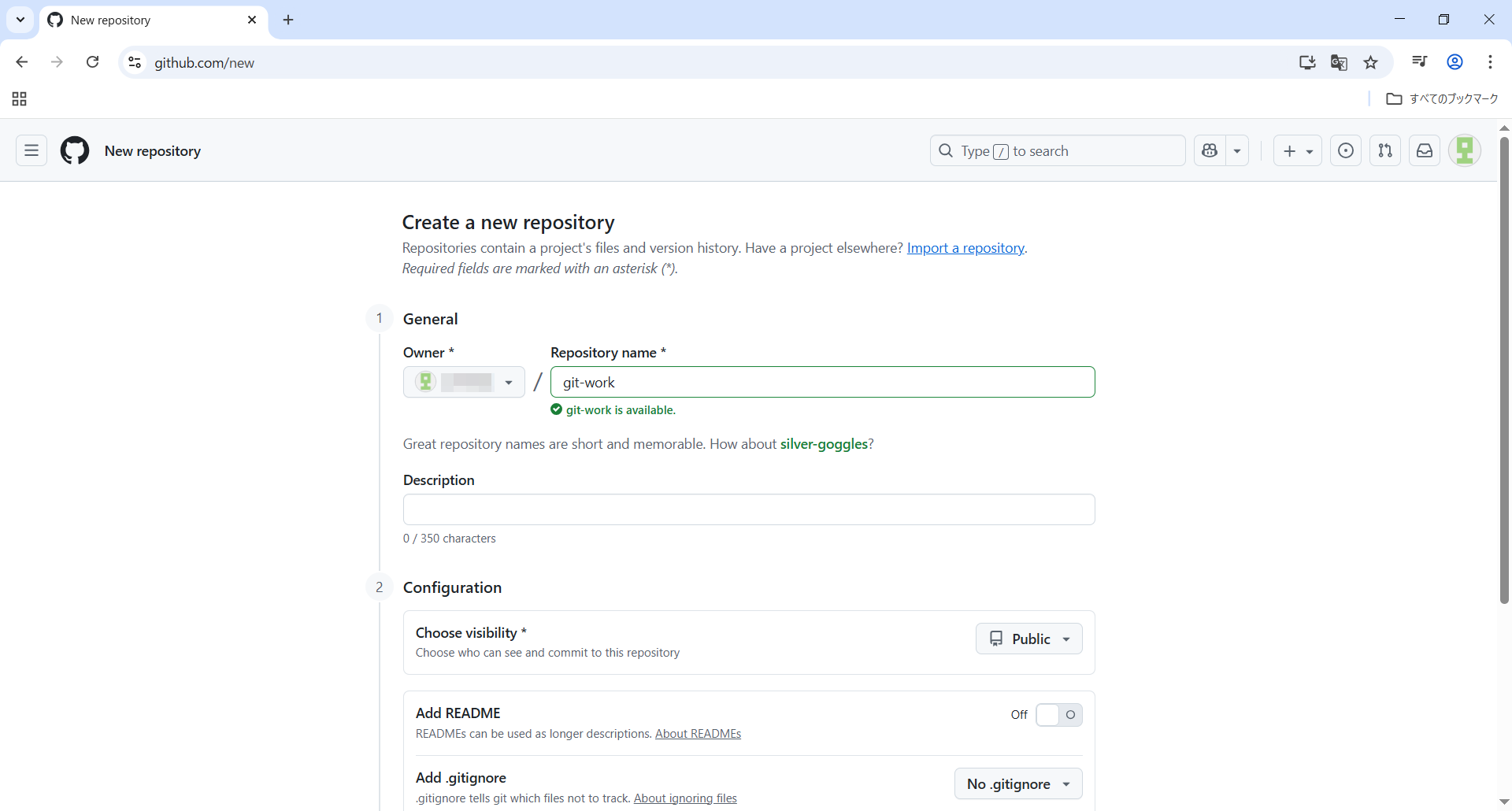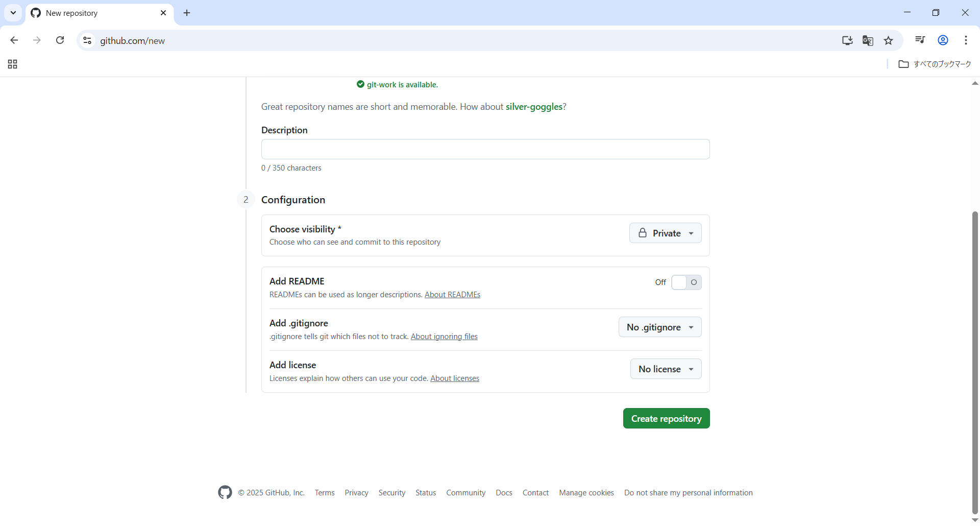 Repository nameにgit-workと入力したところgit-work is availableと表示されました。