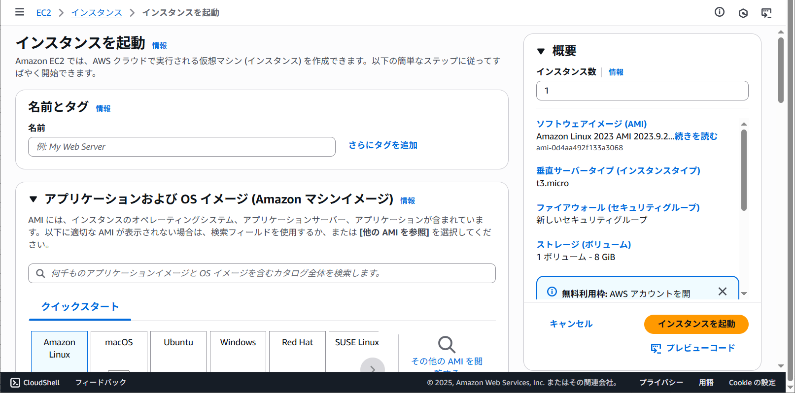 | Amazonマシンイメージ (AMI) | Amazon Linux 2023 kernel-6.1 AMI |
