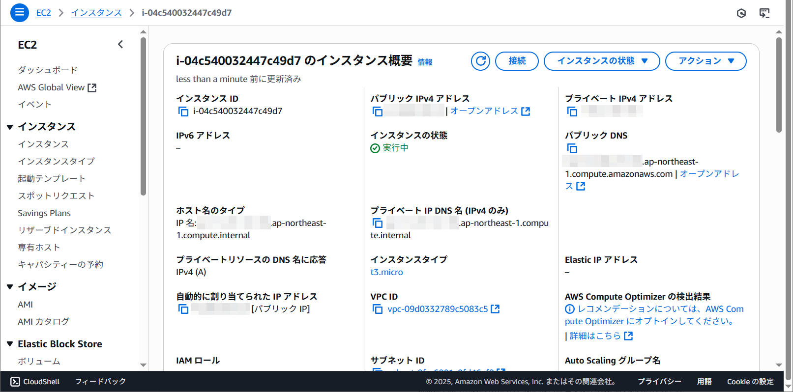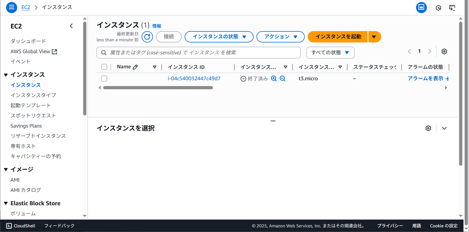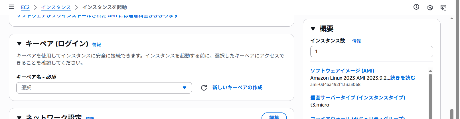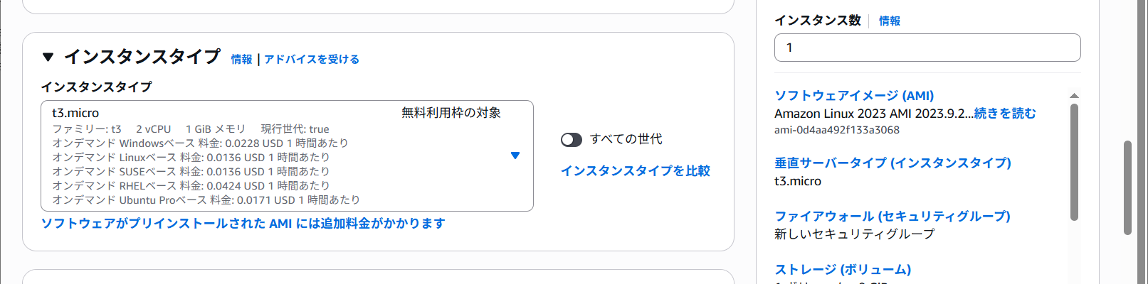 | インスタンスタイプ | t3.micro |