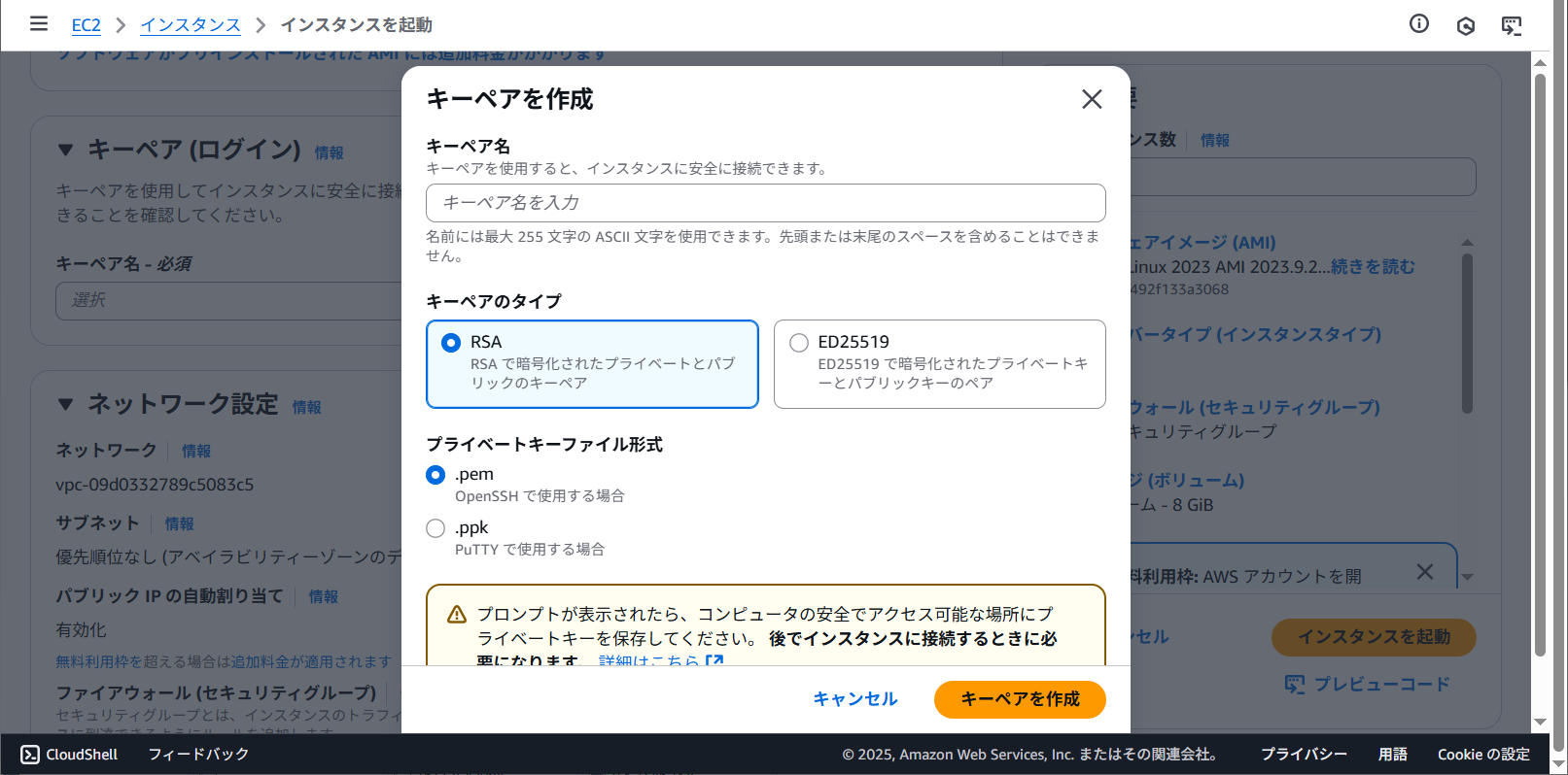 キーペアはキーペア欄の新しいキーペアの作成をクリックします。