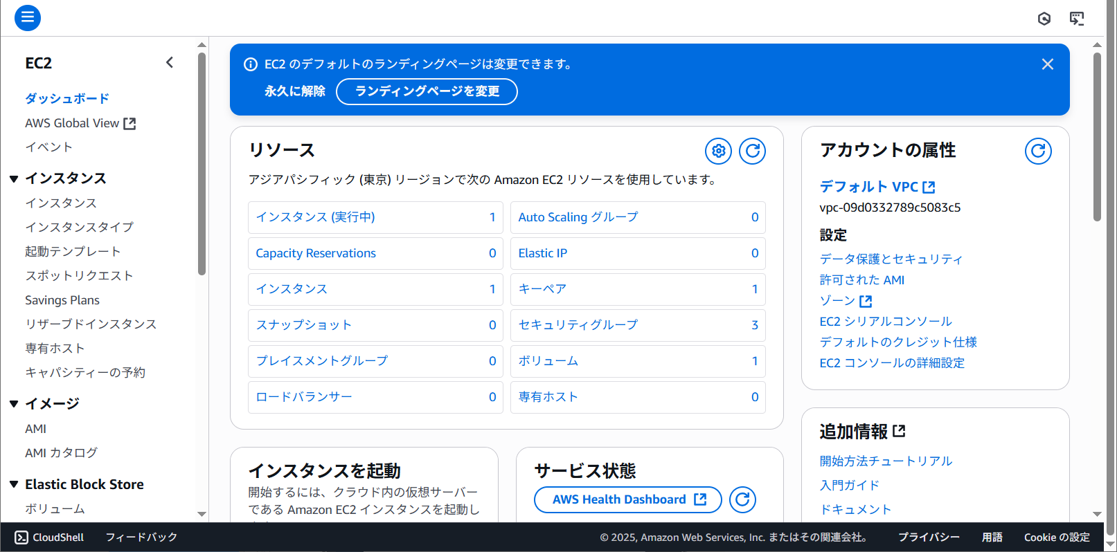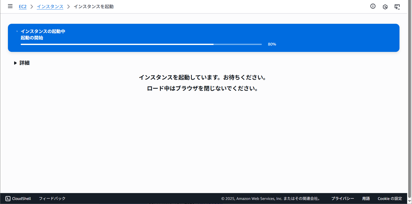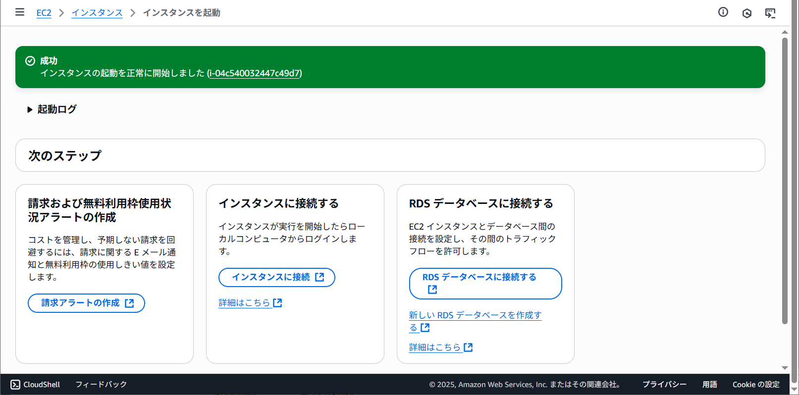インスタンスを起動をクリックするとインスタンスを起動しています。というメッセージが表示されました。