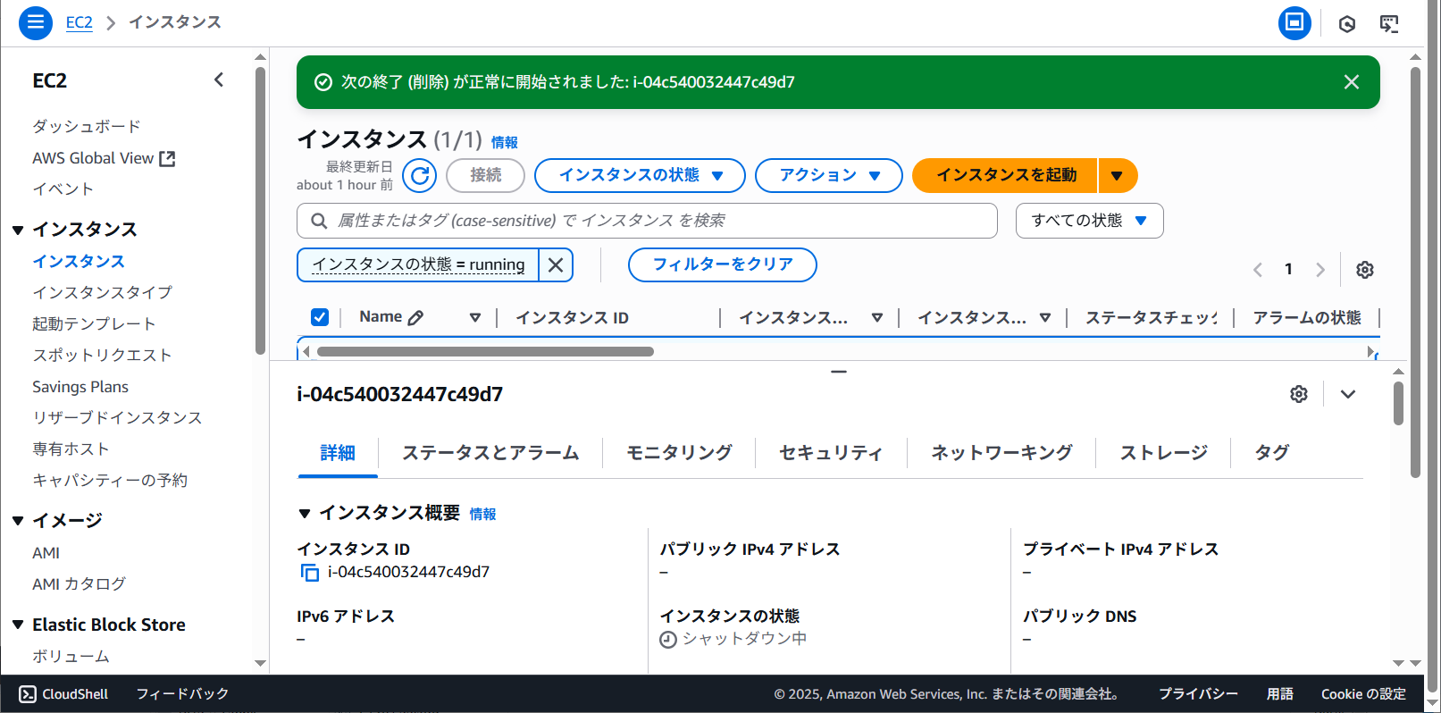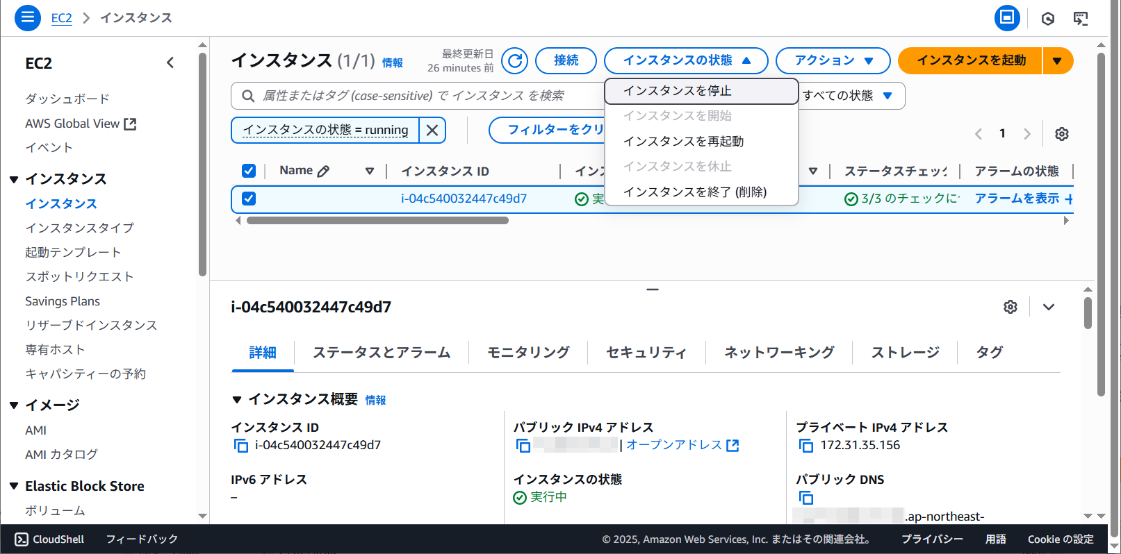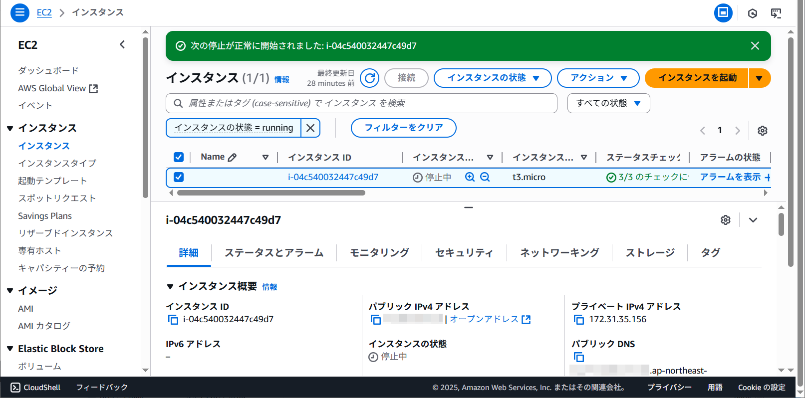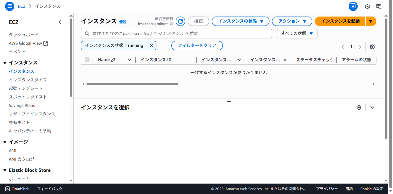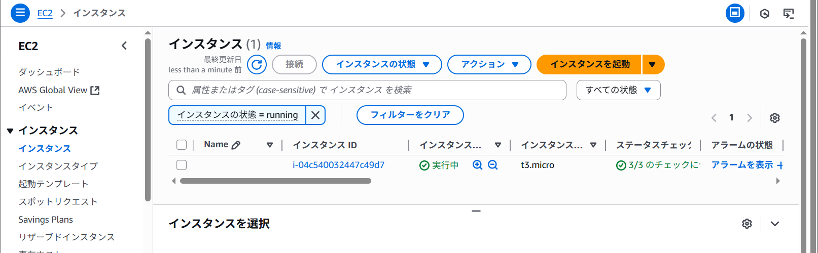 インスタンスの一覧に実行中と表示されました。