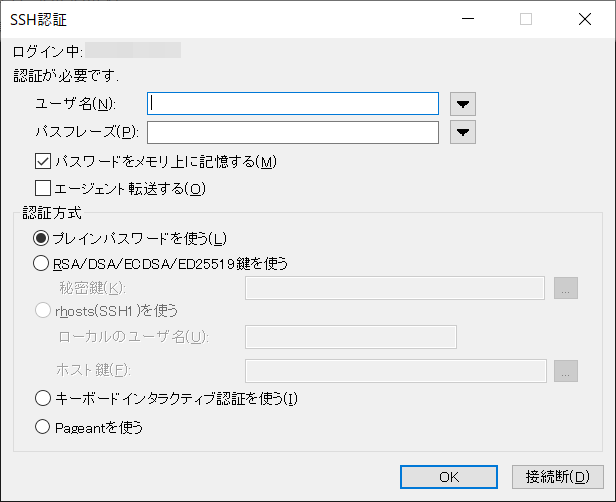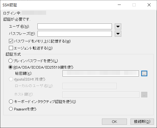 RSA/DSA/ECDSA/ED25519を使うを選択し右の...ボタンを押しダウンロードしたpemファイルを指定します。