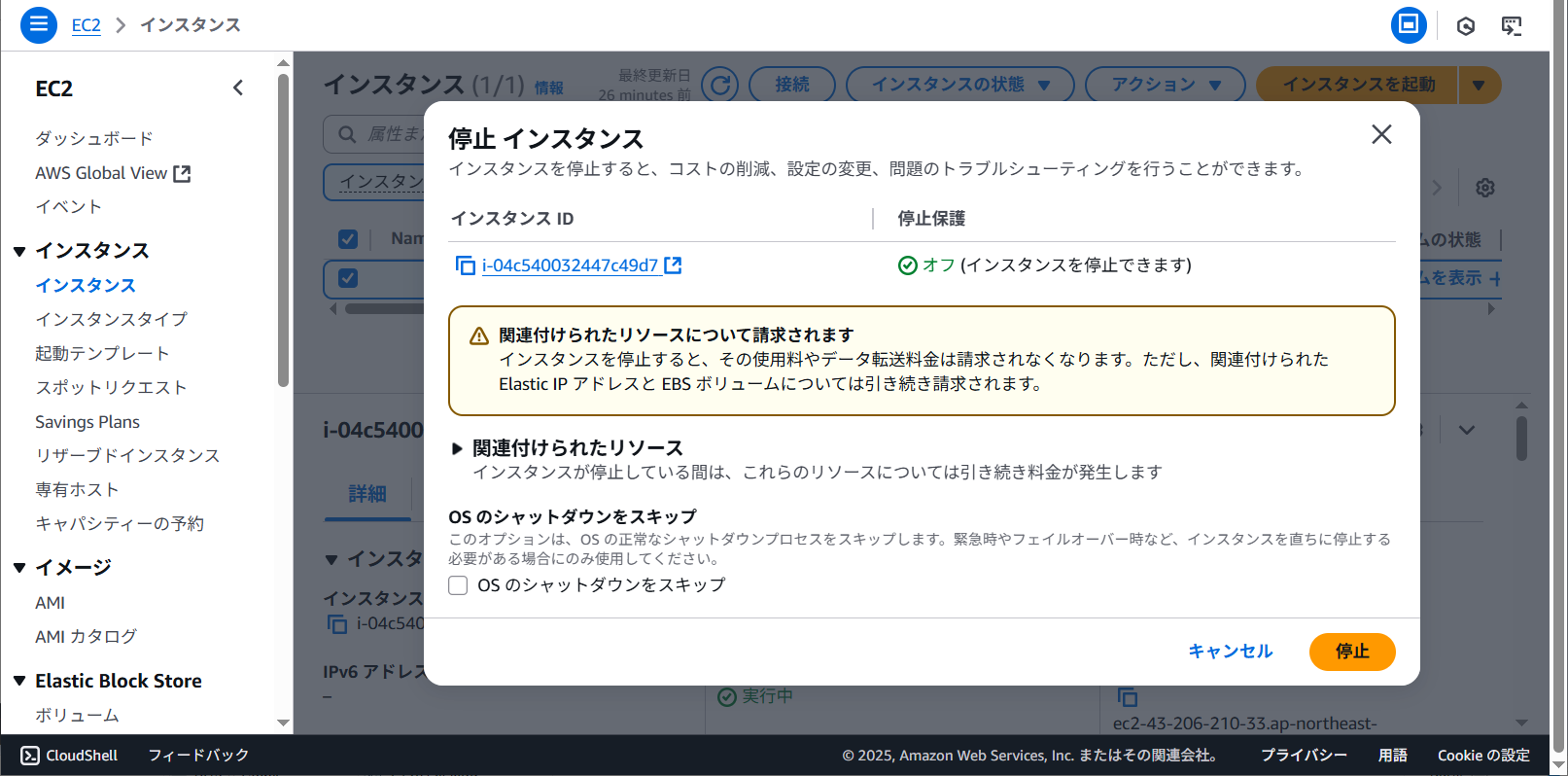 インスタンスを停止すると使用料は請求されなくなるが関連付けられているリソースは引き続き請求される旨が表示されています。 関連付けられたリソースをクリックします。