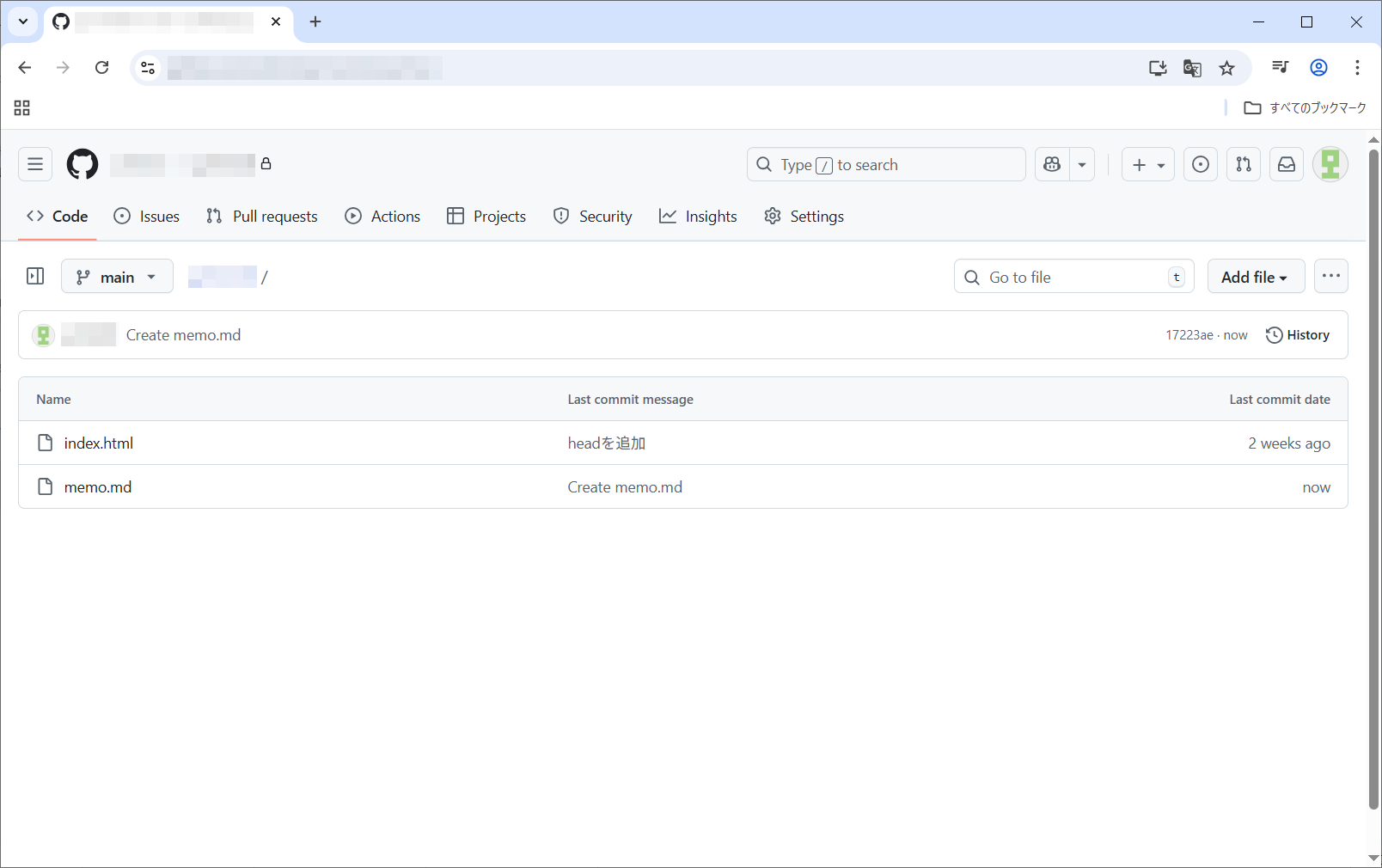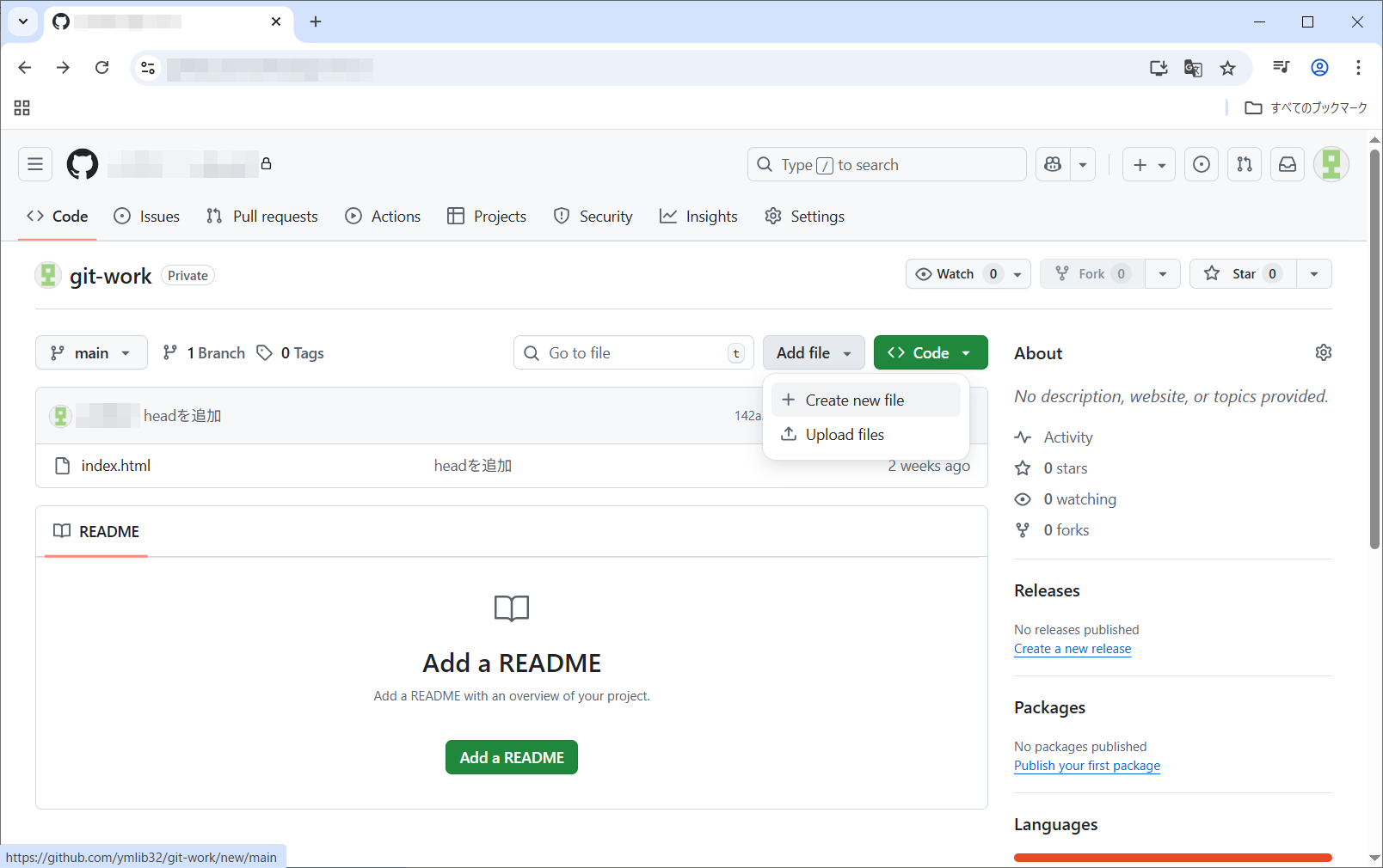 GitHubのページでリポジトリを開きAdd fileをクリックしCreate new fileをクリックします。