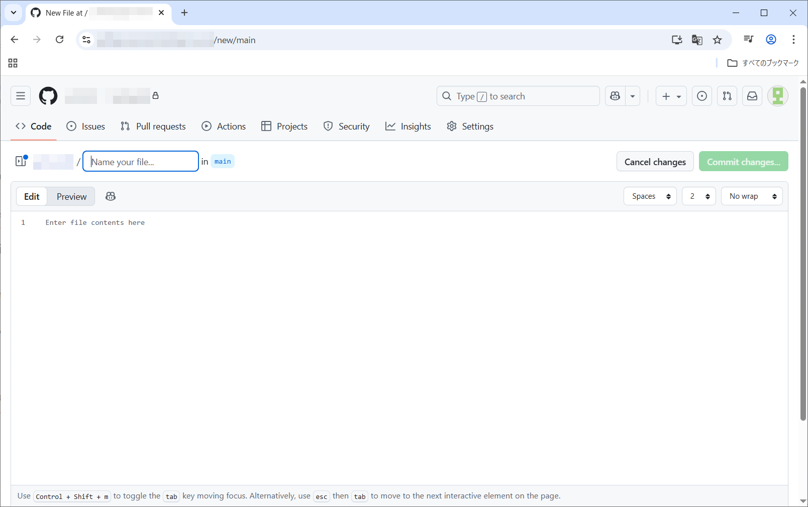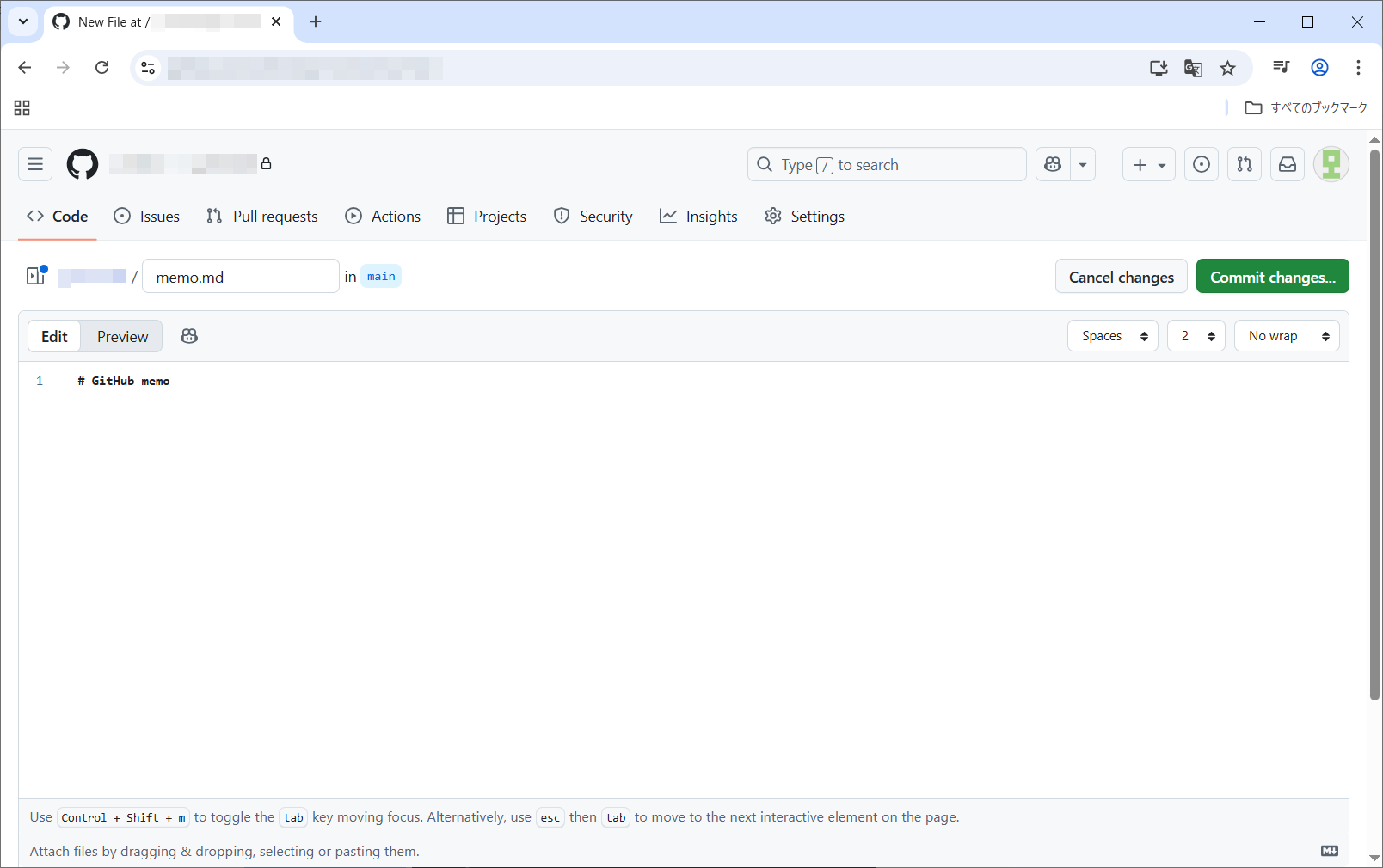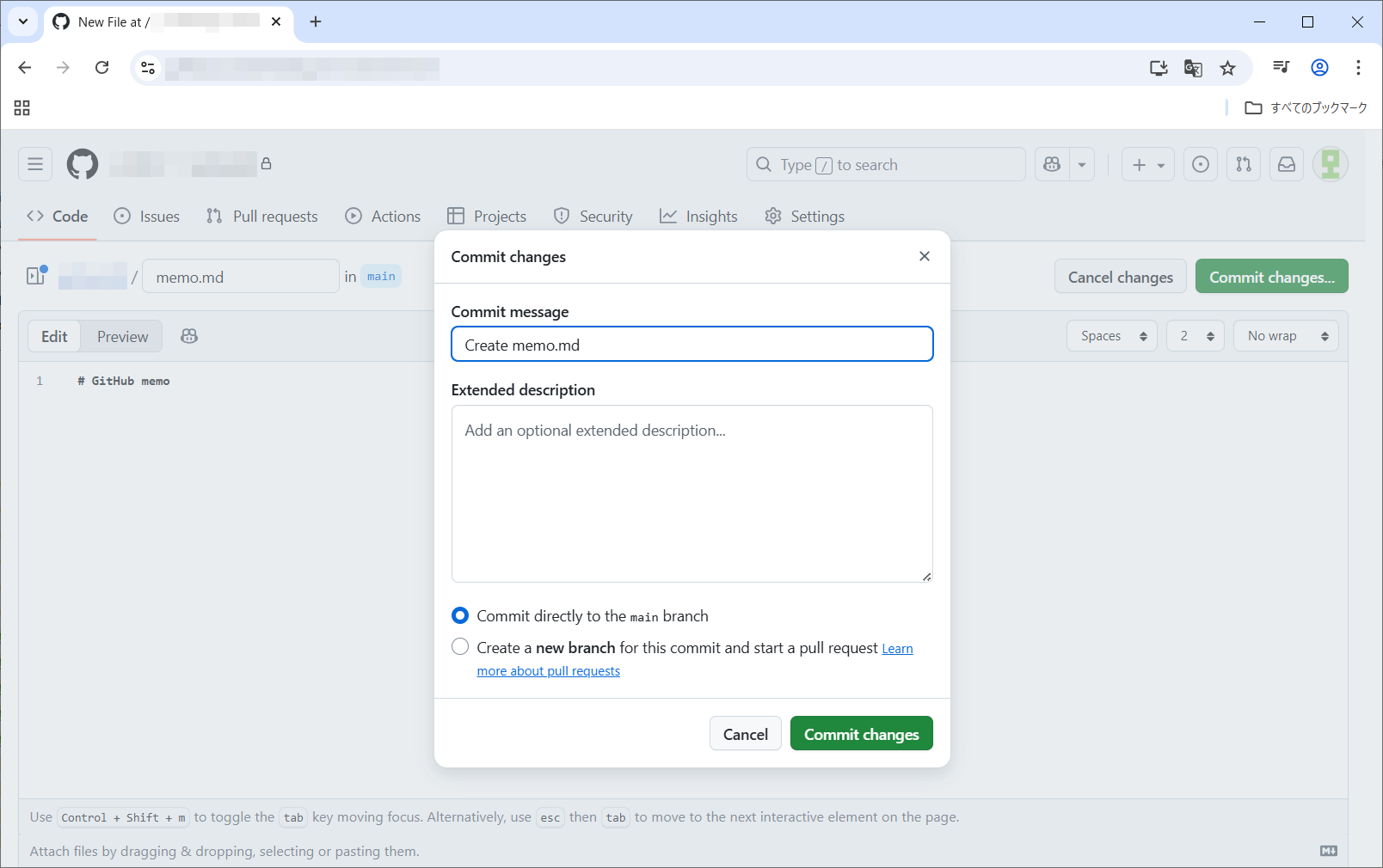 memo.mdという名前で内容は#GitHub memoだけ記載し右上のCommit changes...をクリックします。