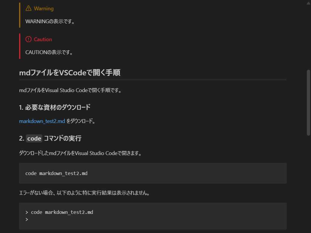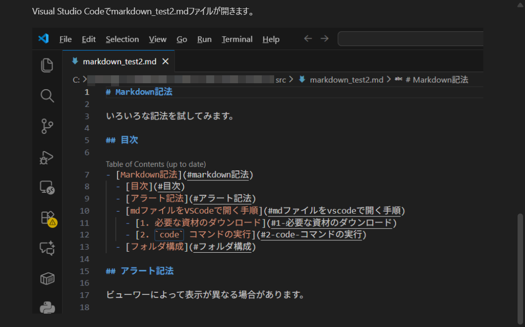 Visual Studio Codeでmarkdown_test2.mdファイルが開きます。