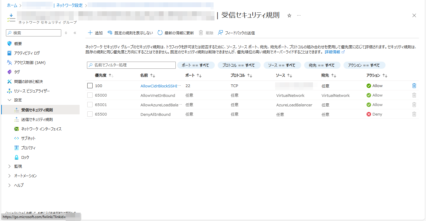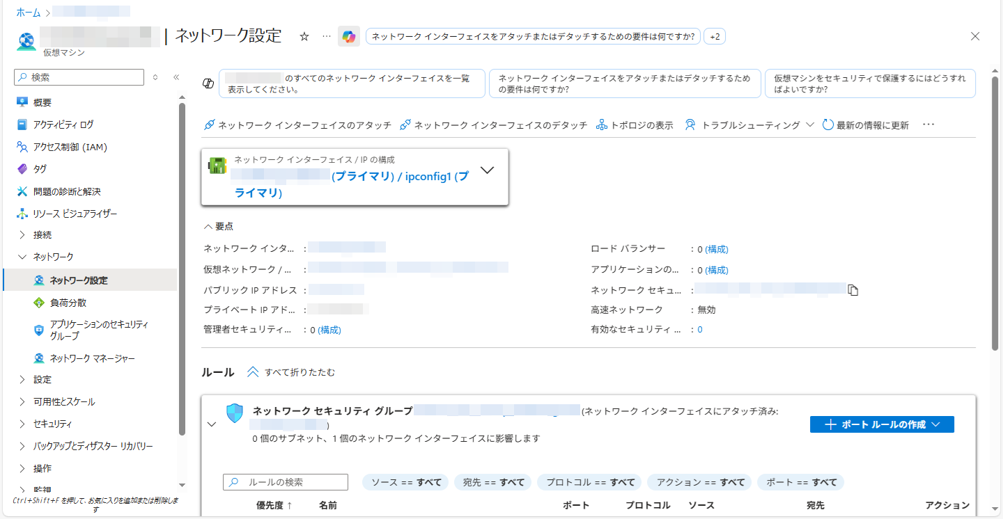 特定のIPアドレスからの接続を許可したいVMを開き左のメニューでネットワークのネットワーク設定をクリックし右側のネットワークセキュ...に表示されているURLをクリックします。