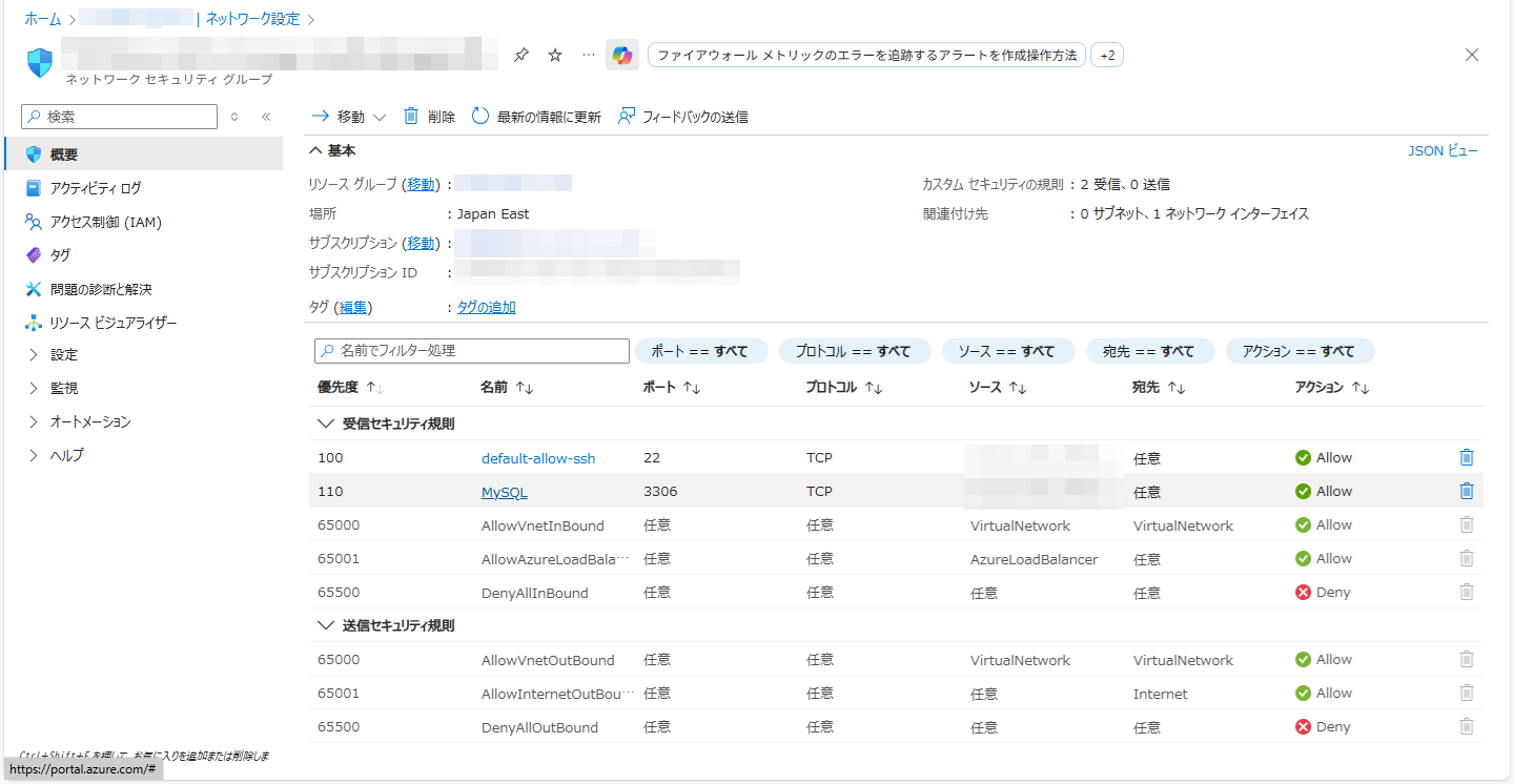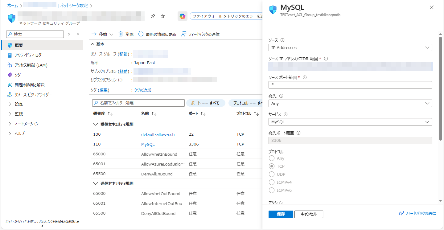 AzureのVMで192.168.100.5からMySQLのポート3306への接続許可をしてみます。