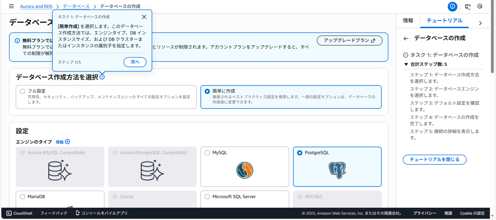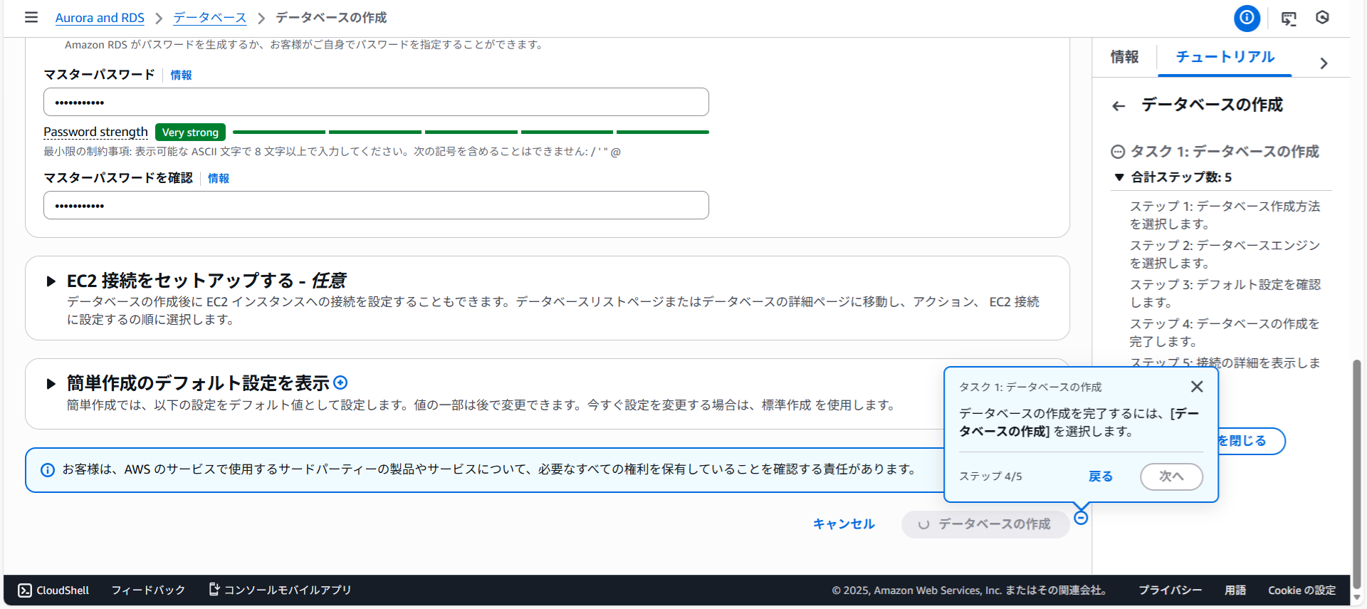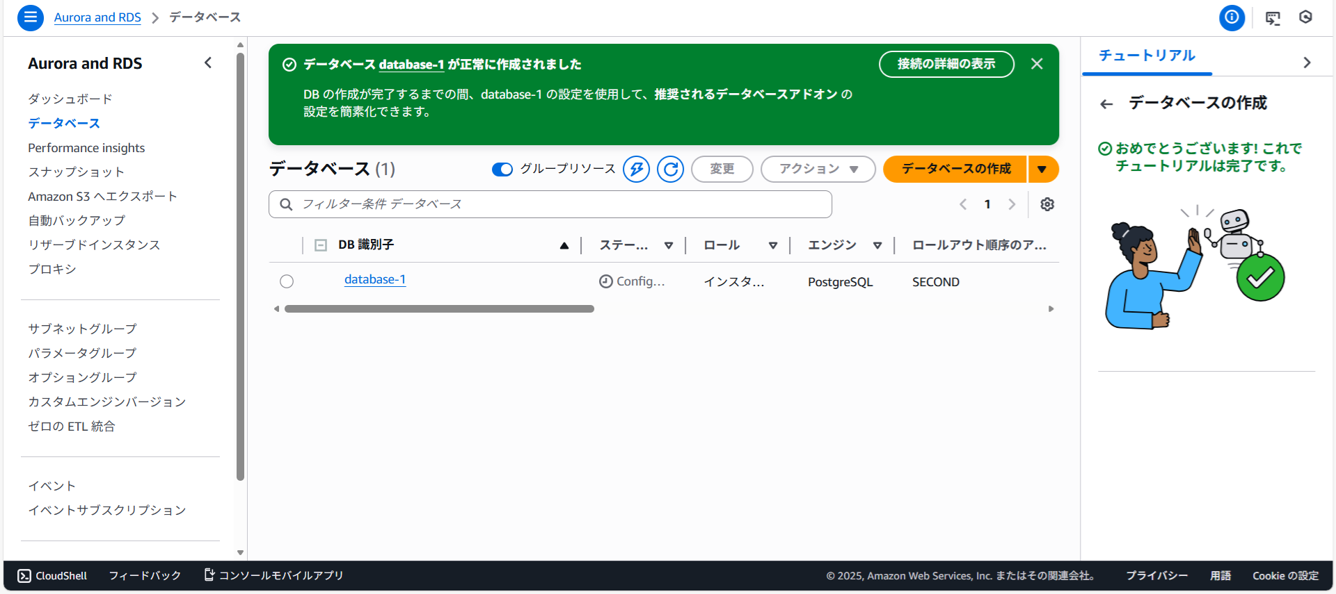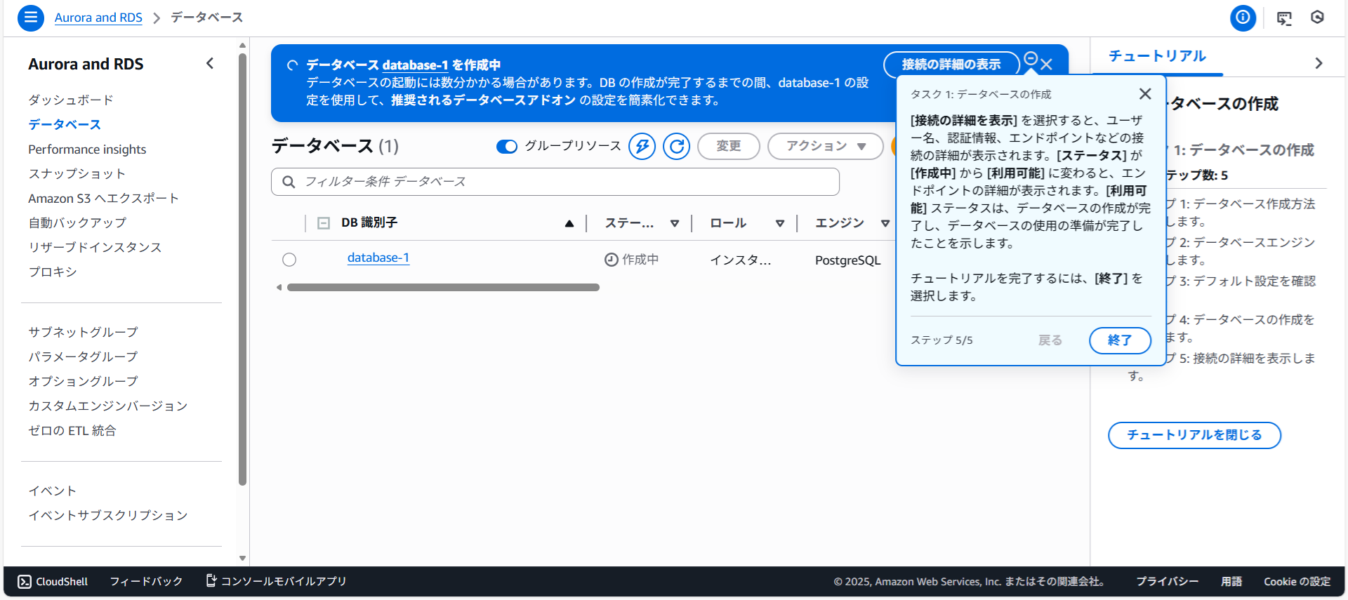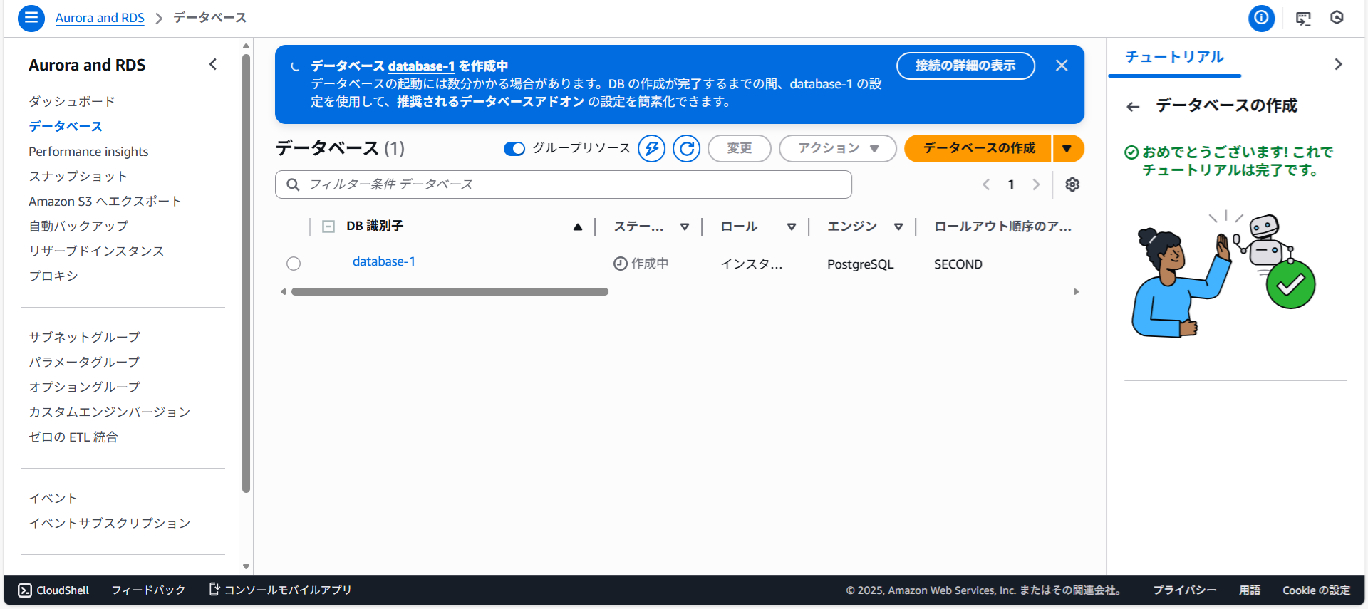 画面が切り替わりデータベースdatabase-1を作成中と表示されました。