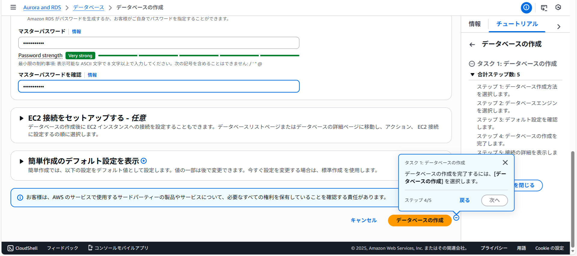 マスターパスワードとマスターパスワードを確認を入力し、データベースの作成をクリックします。