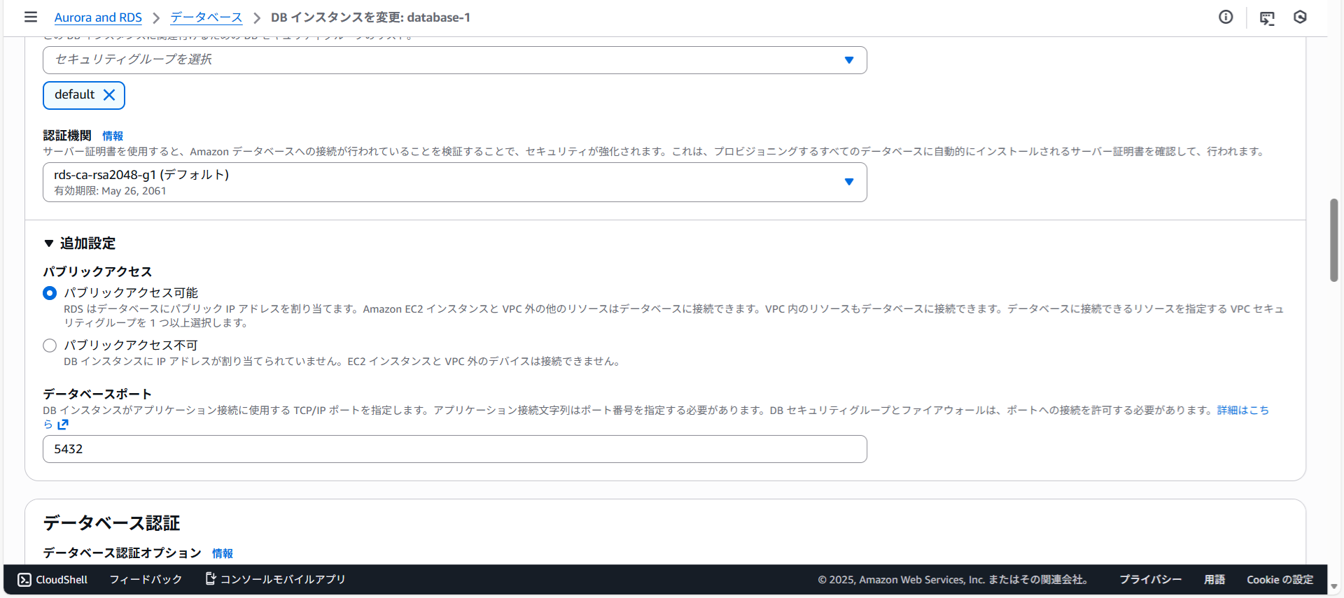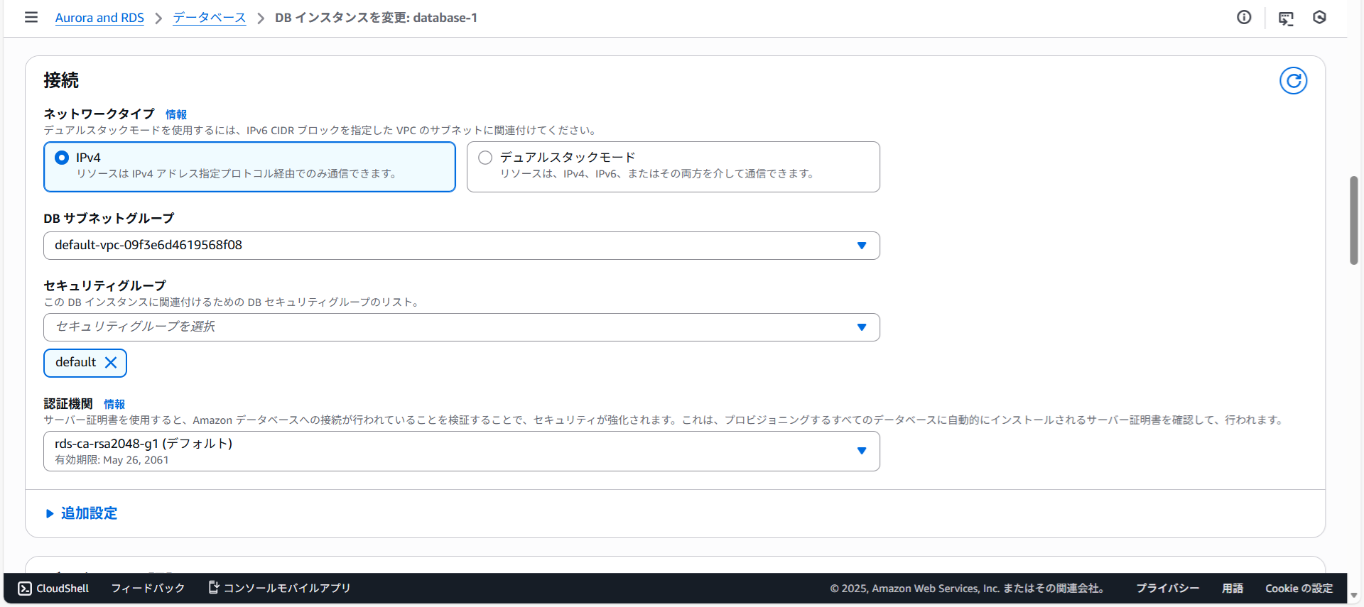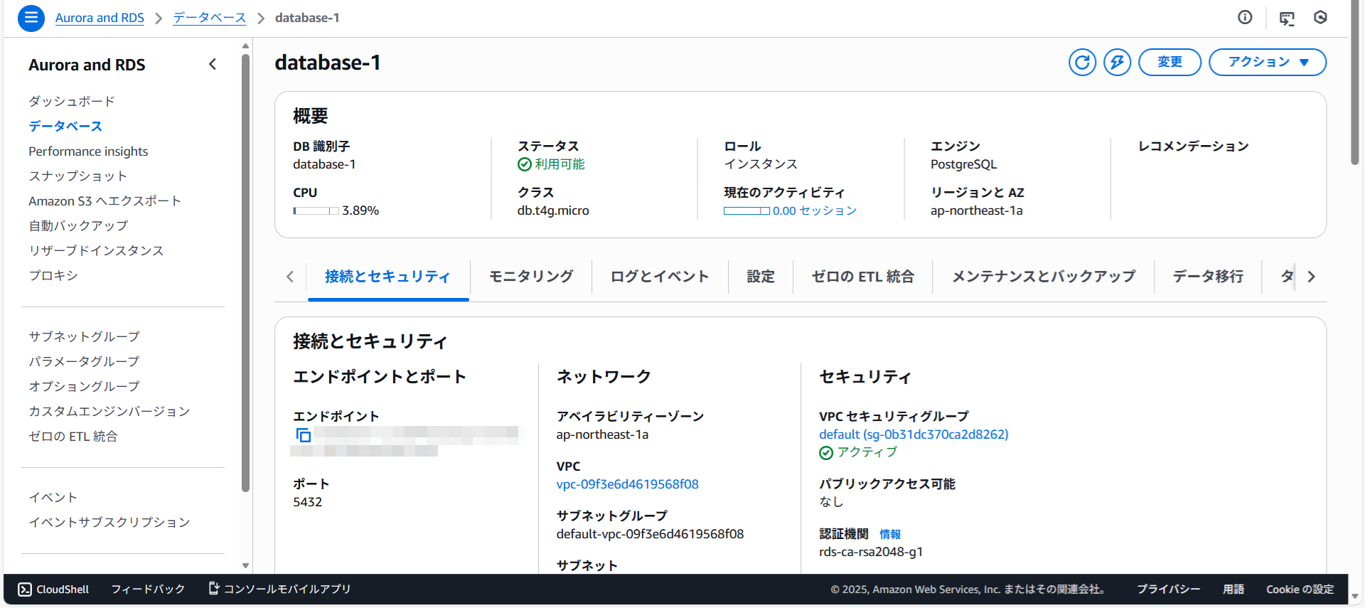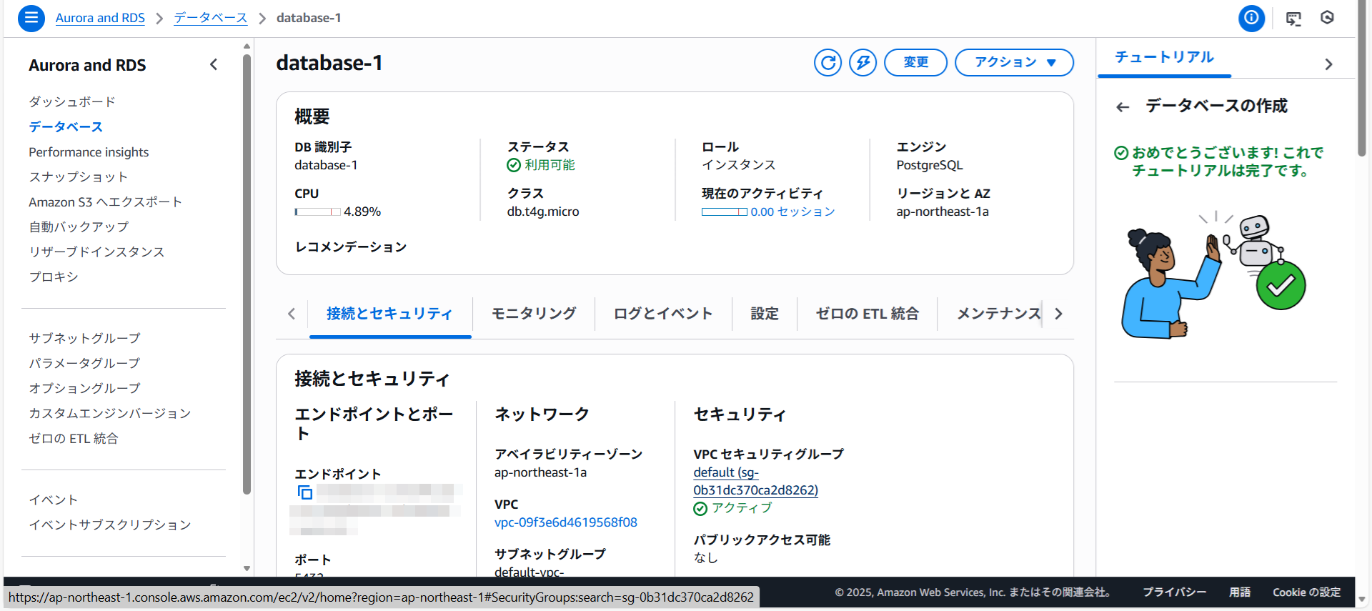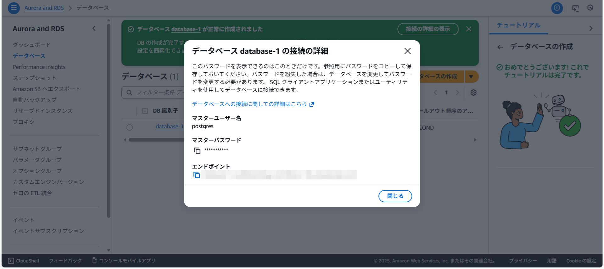 データベースdatabase-1への接続情報が表示されました。