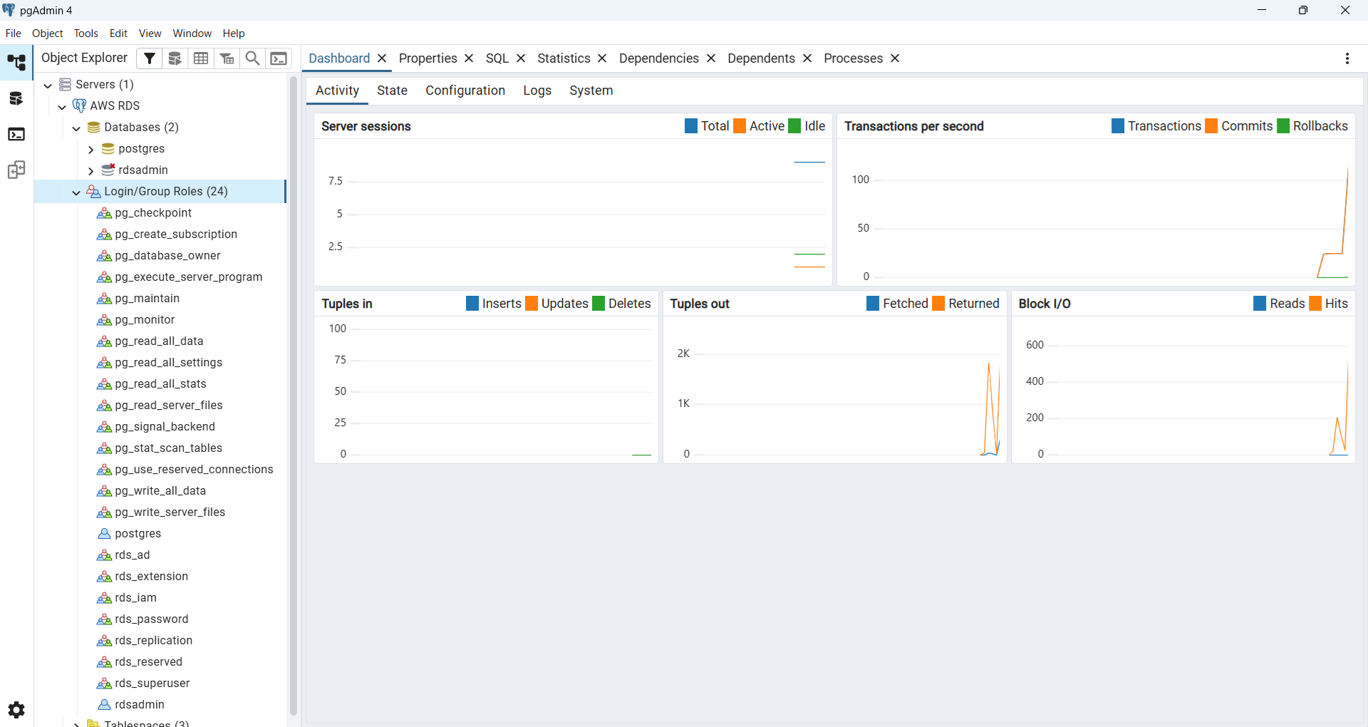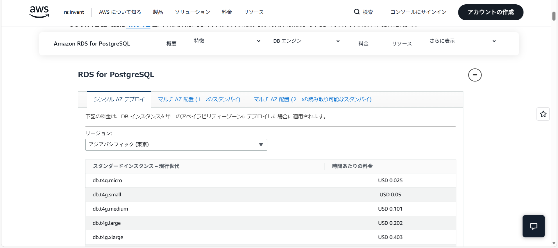 今回作成したRDSはPostgreSQLで東京リージョンでクラスはdb.t4g.microでした。 ウェブ上の料金表を見たところ時間あたりUSD 0.025なので1時間1.5円ぐらいですね。