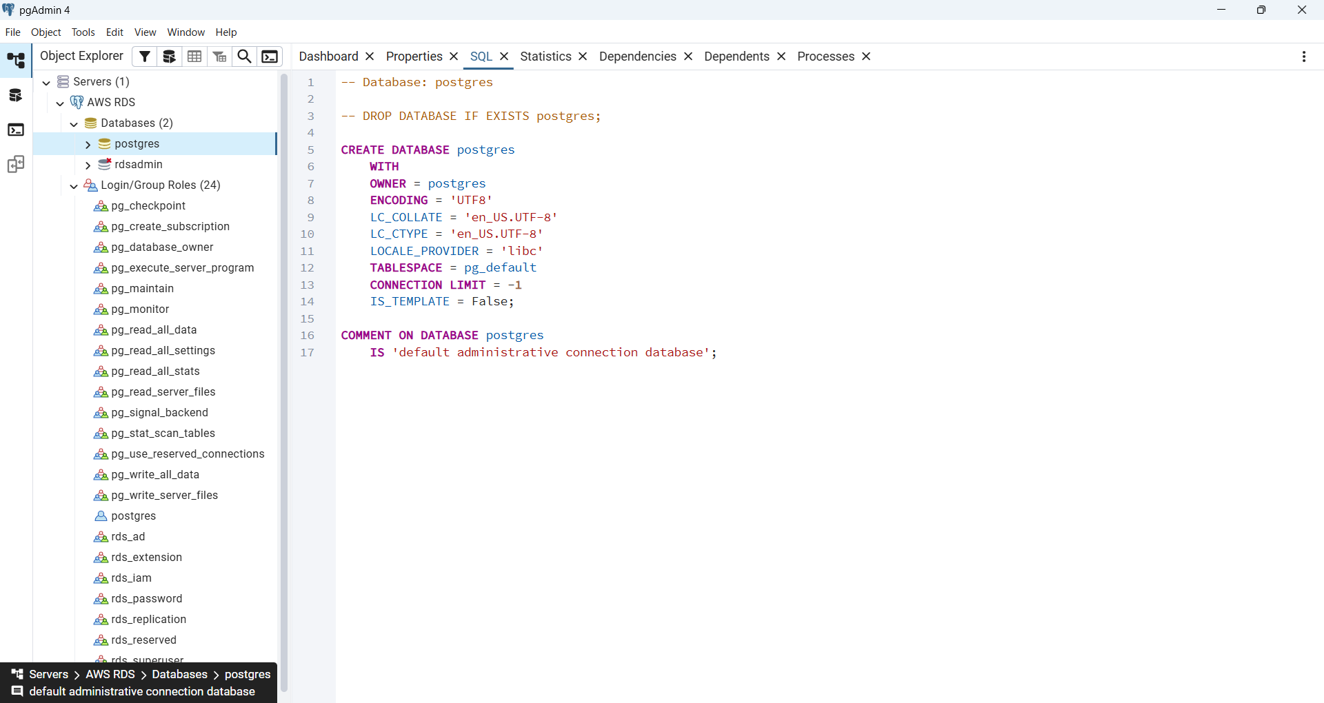 左のpostgresをクリックしたところSQLにCREATE DATABASEが表示されました。