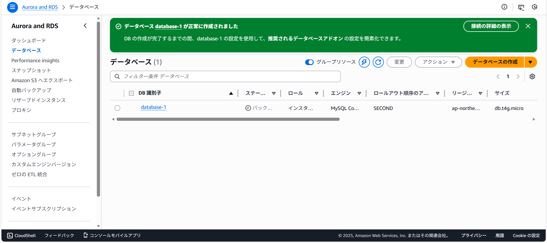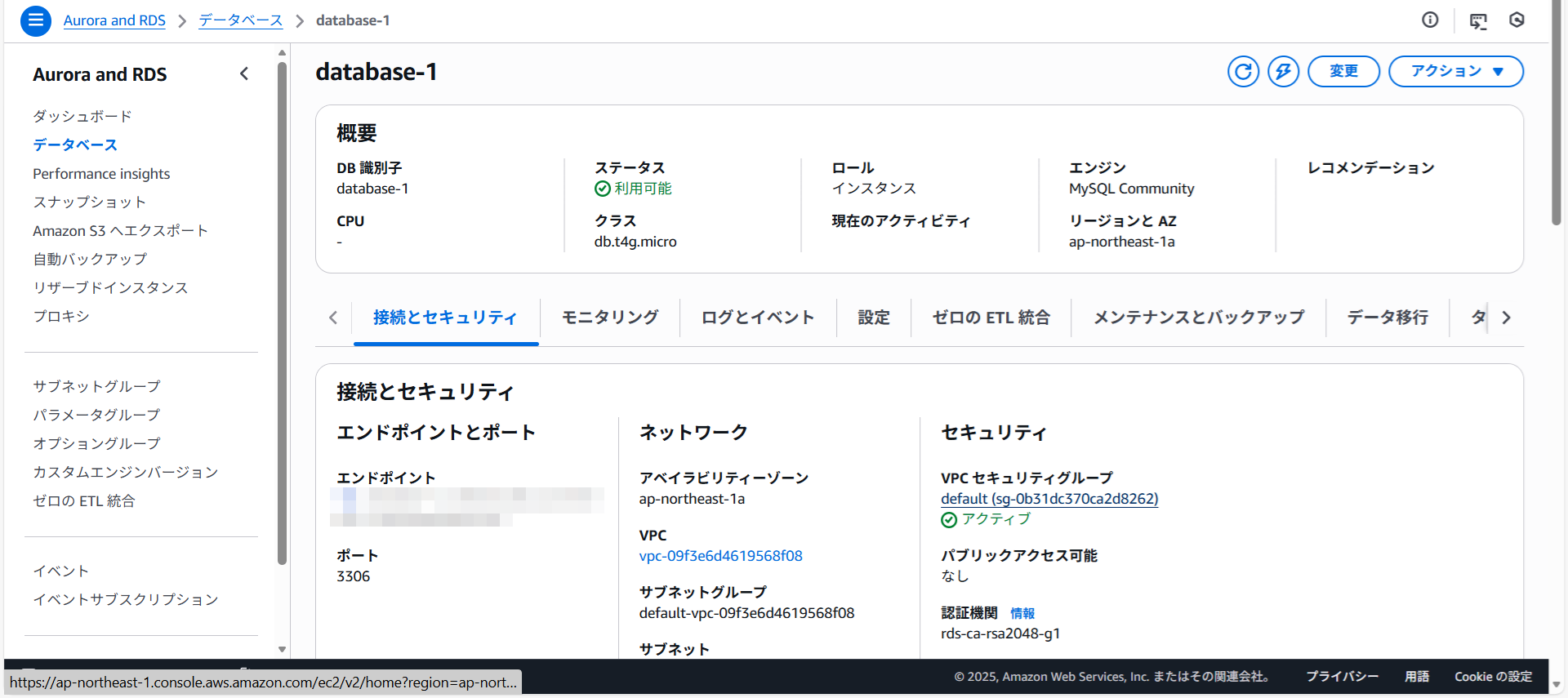 してください。DockerコンテナのbushからRDSのMySQLへ接続できた方が設定がしやすいのでRDSのMySQLに外部から接続できるように設定します。