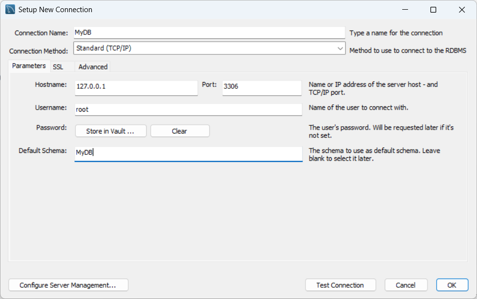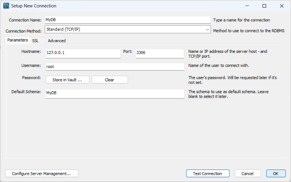 Setup New Connection画面が開くので必要な情報を入力しTest Connectionをクリックします。