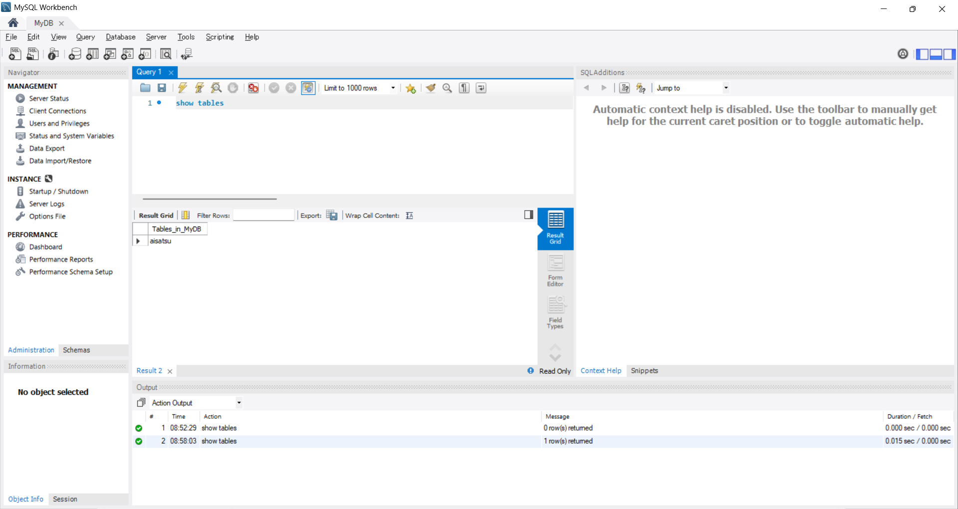 show tablesと入力しかみなりマークを押します。 クエリが実行され結果が下に表示されました。