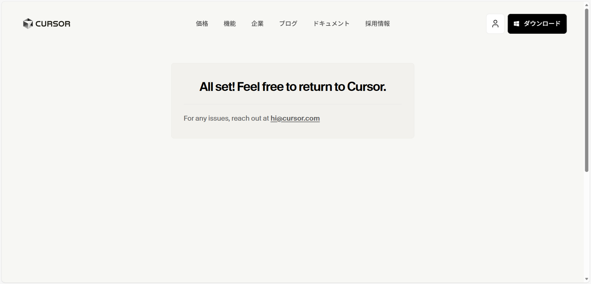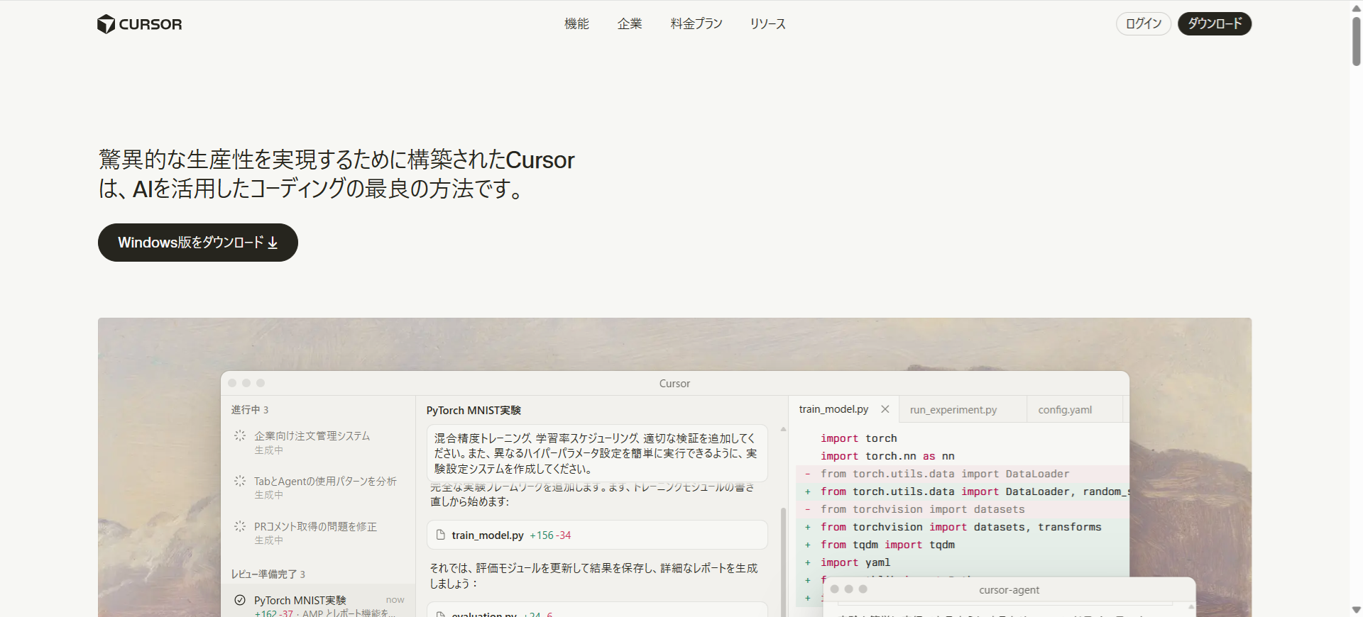 Cursorのページを開きWindows版をダウンロードをクリックします。