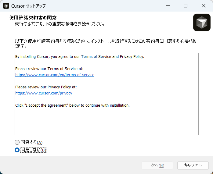 同意するを選択し次へをクリックします。