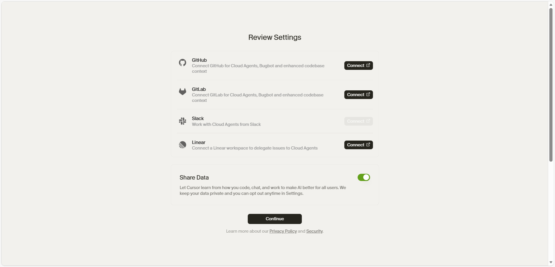 Share DataをOFFにしてContinueをクリックします。