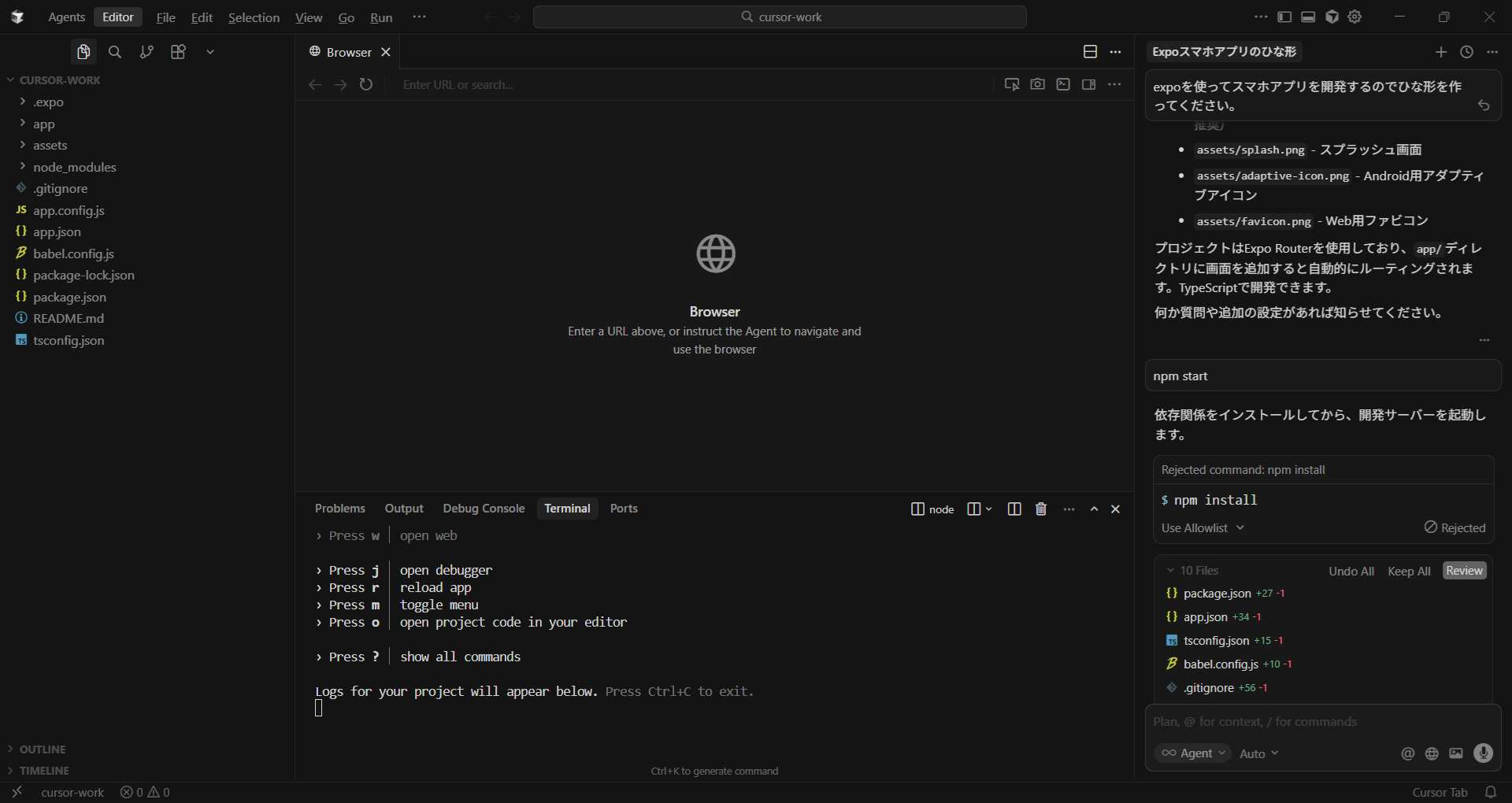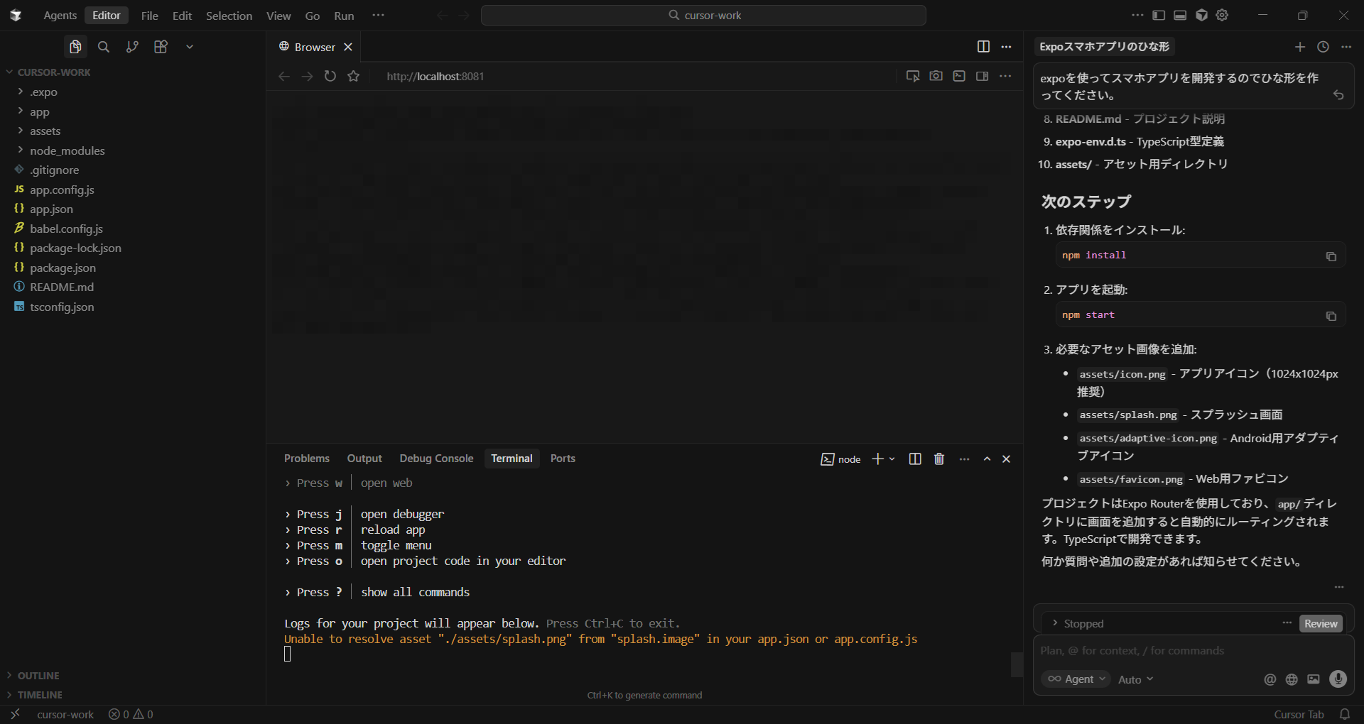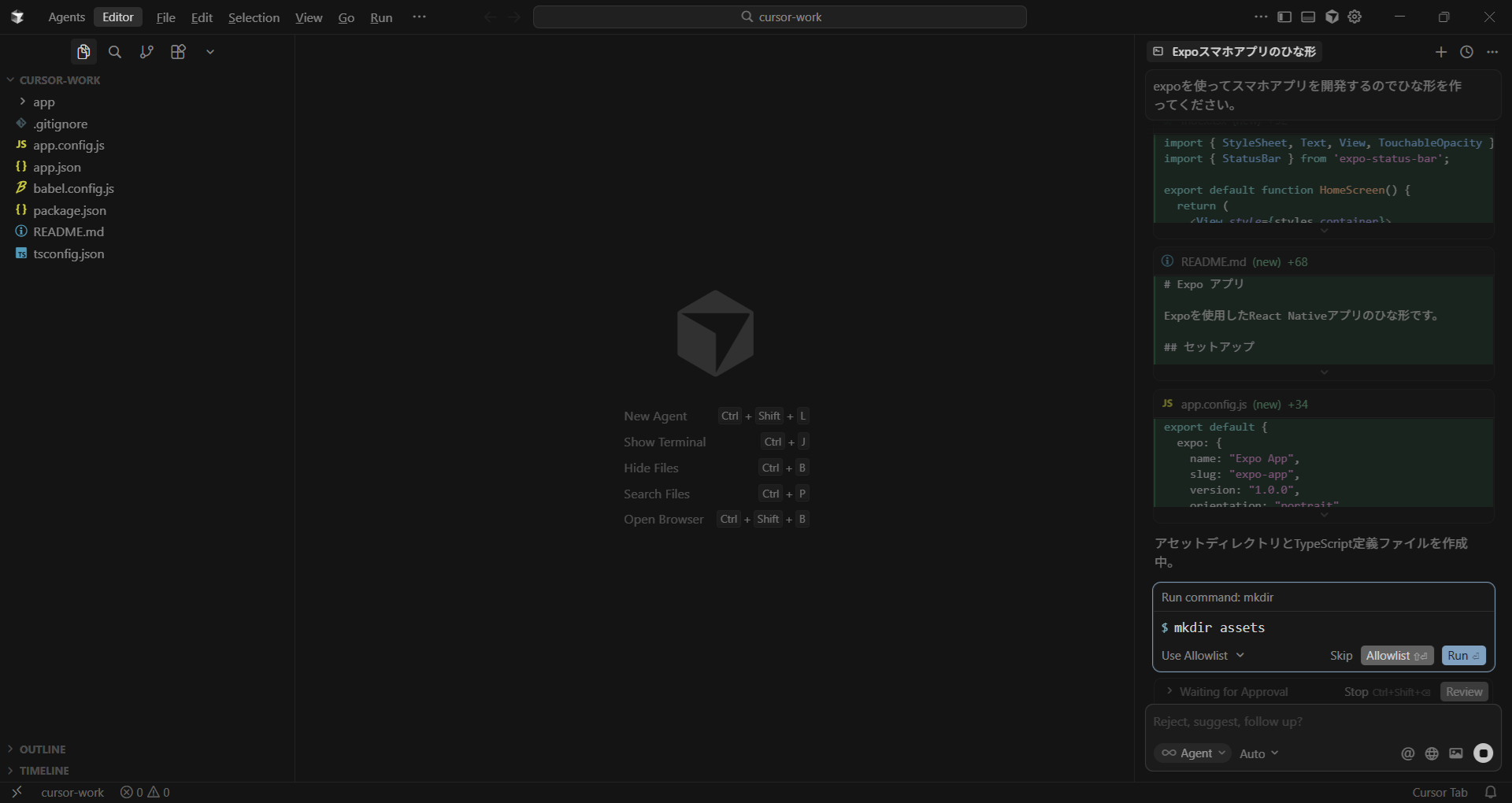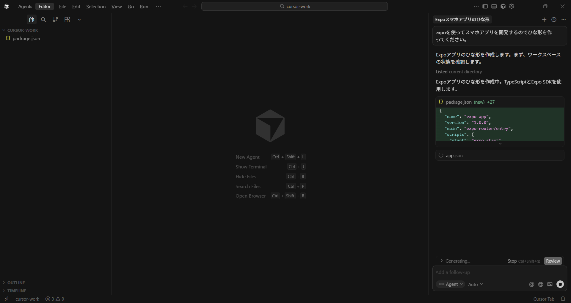 Cursorを起動しAIチャットウィンドに「expoを使ってスマホアプリを開発するのでひな形を作ってください。」と入力しEnterを押します。