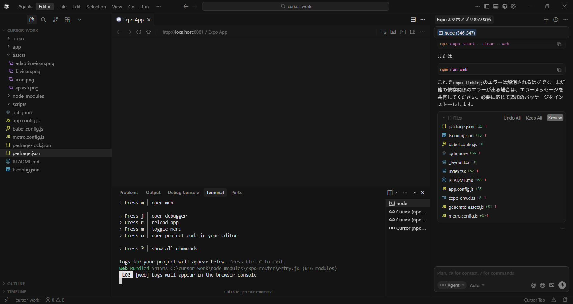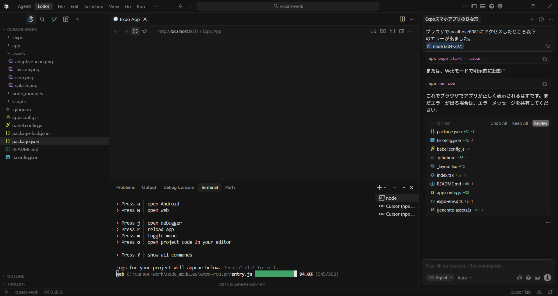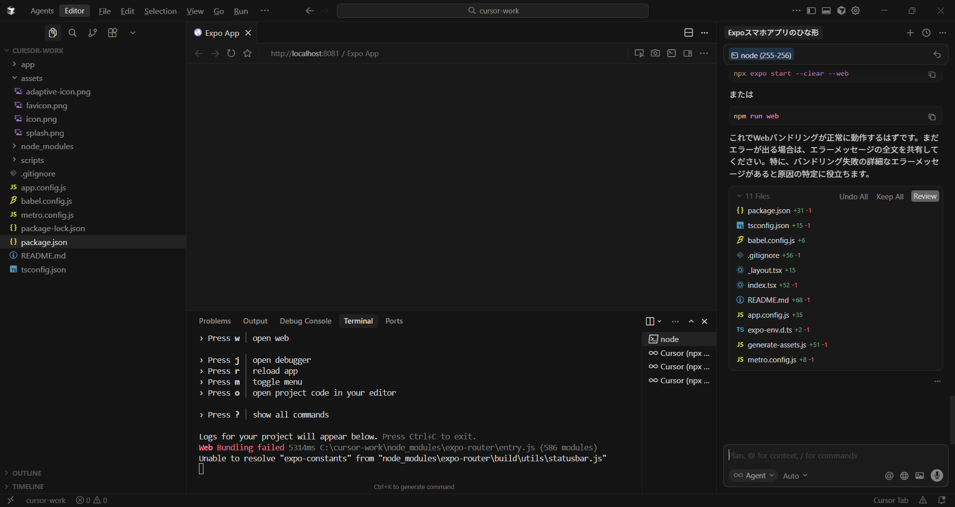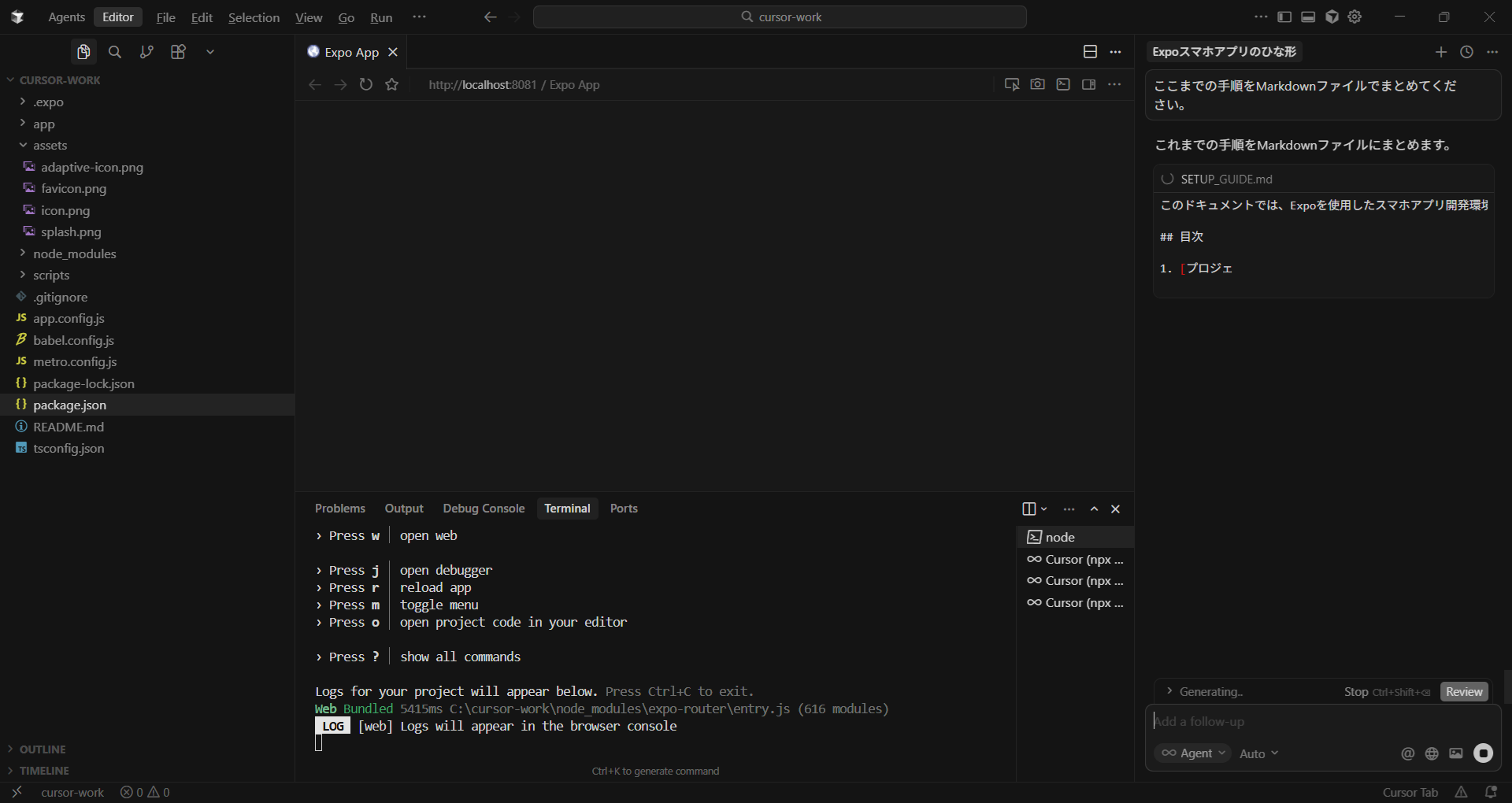 Cursorを起動しAIチャットウィンドに「expoを使ってスマホアプリを開発するのでひな形を作ってください。」と入力しEnterを押します。