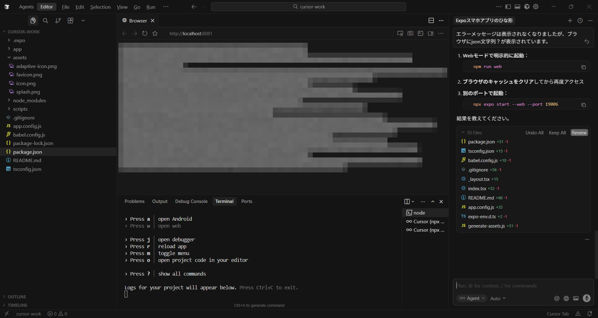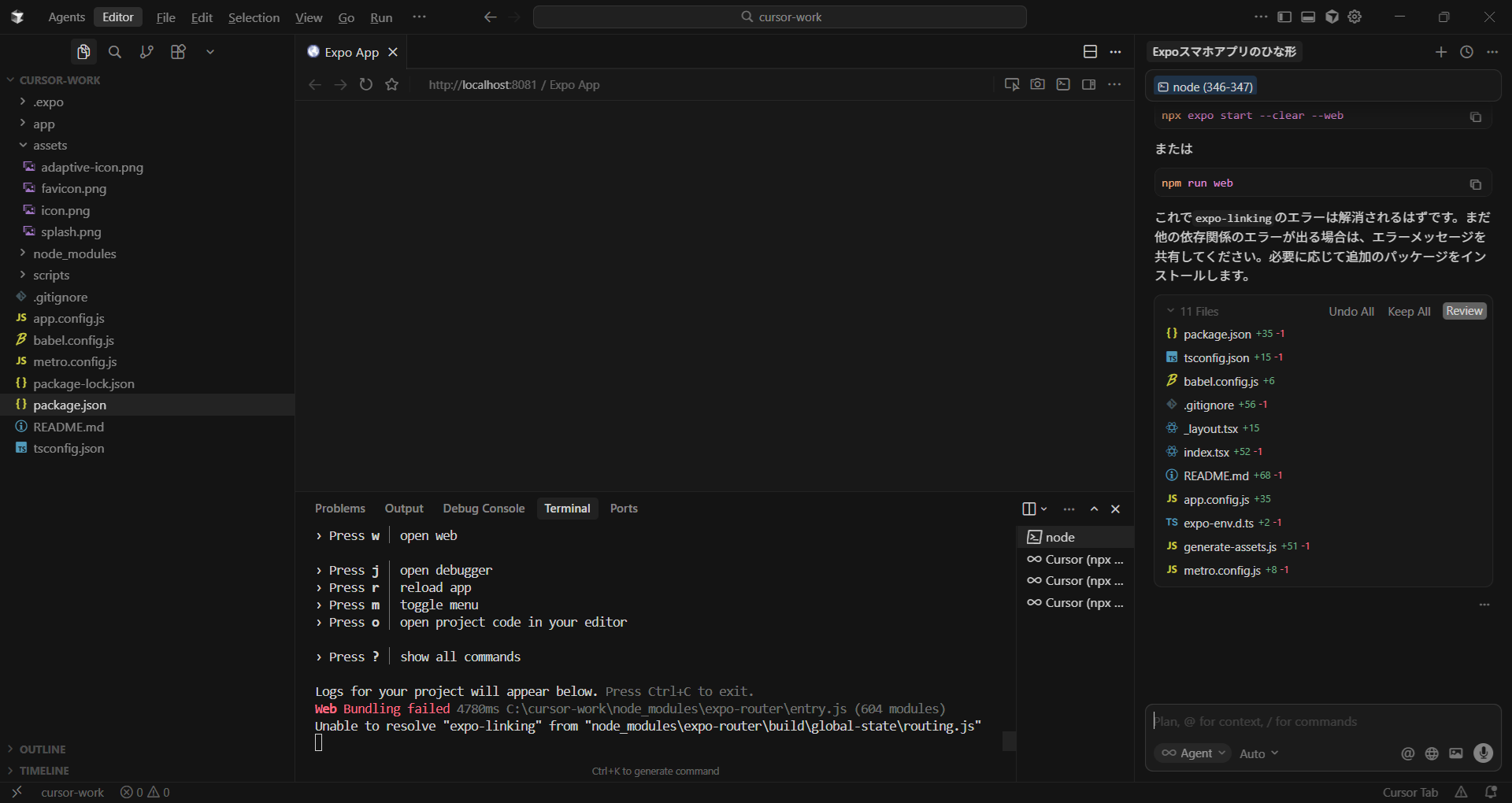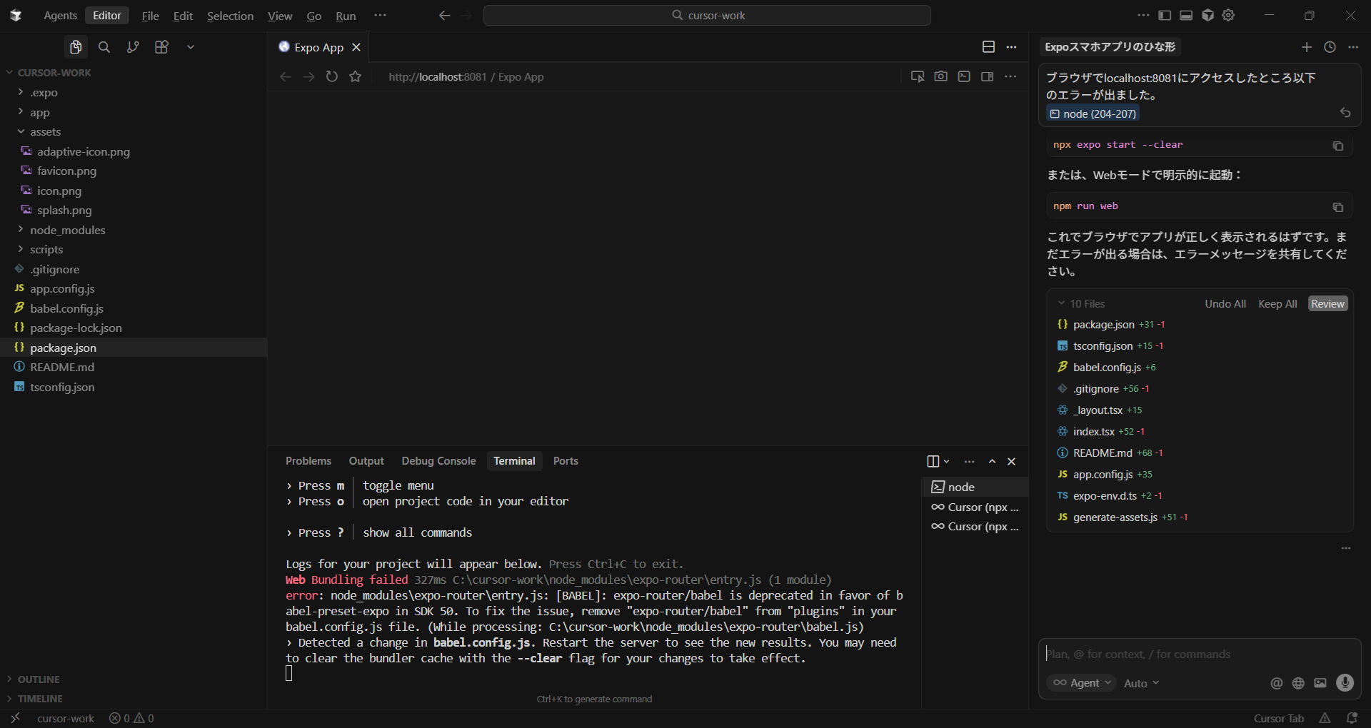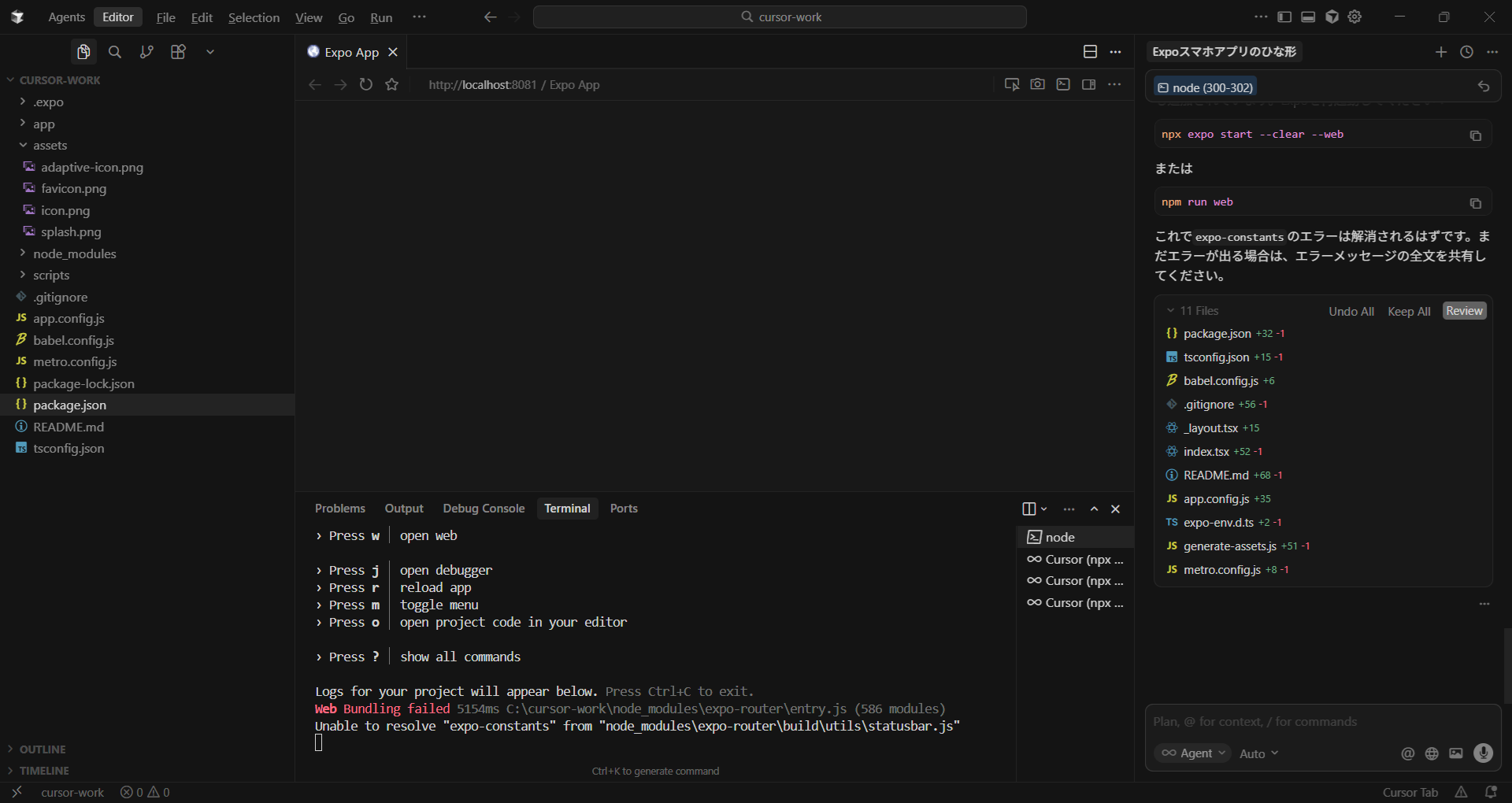 Cursorを起動しAIチャットウィンドに「expoを使ってスマホアプリを開発するのでひな形を作ってください。」と入力しEnterを押します。