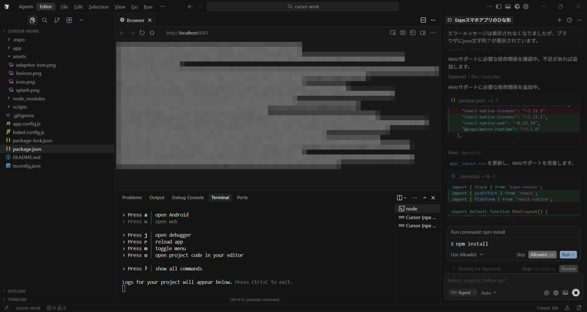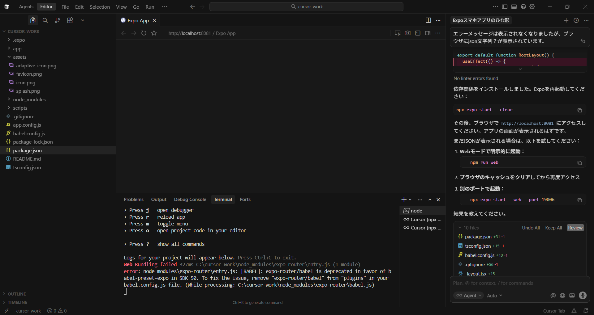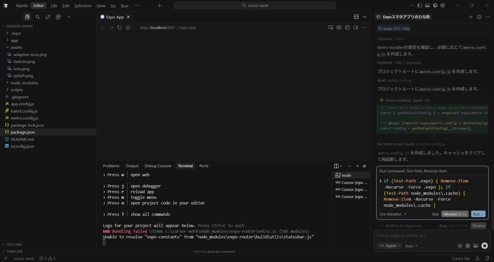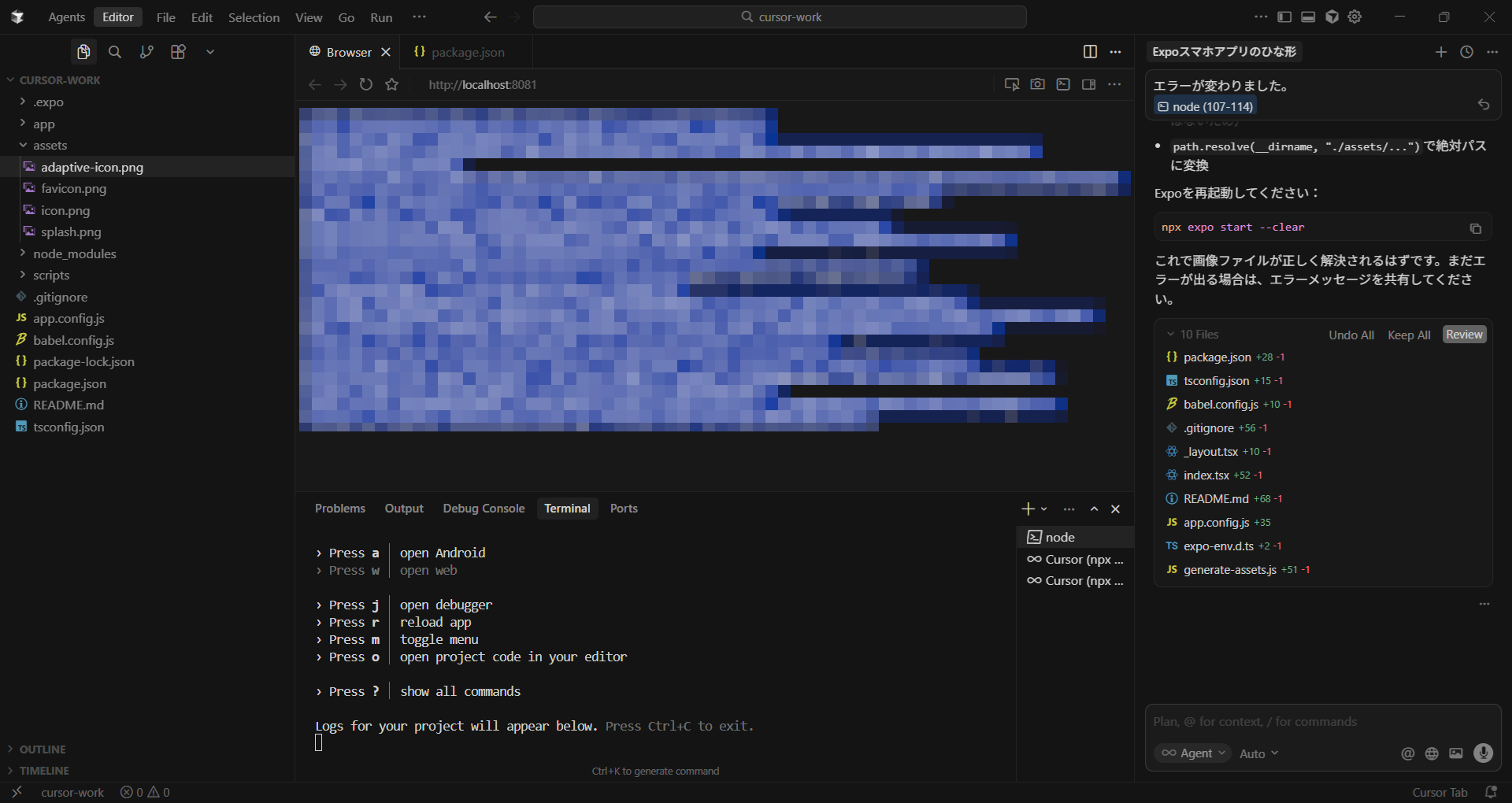 Cursorを起動しAIチャットウィンドに「expoを使ってスマホアプリを開発するのでひな形を作ってください。」と入力しEnterを押します。