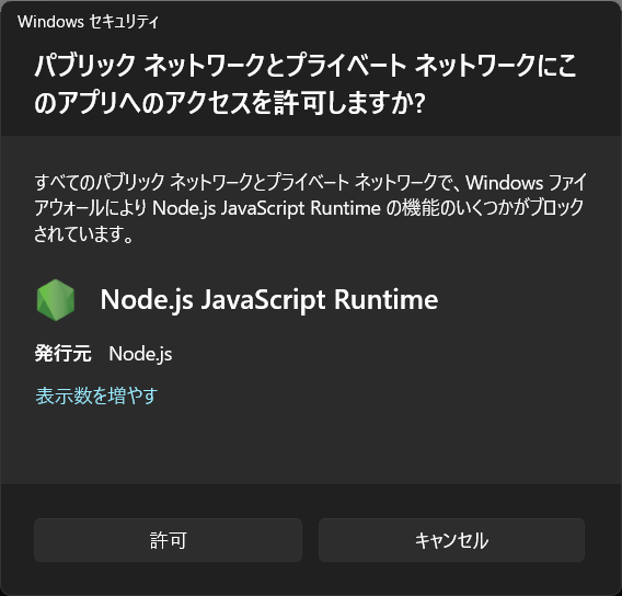 npm startを実行するとアクセス許可のウィンドウが開くので許可をクリックします。