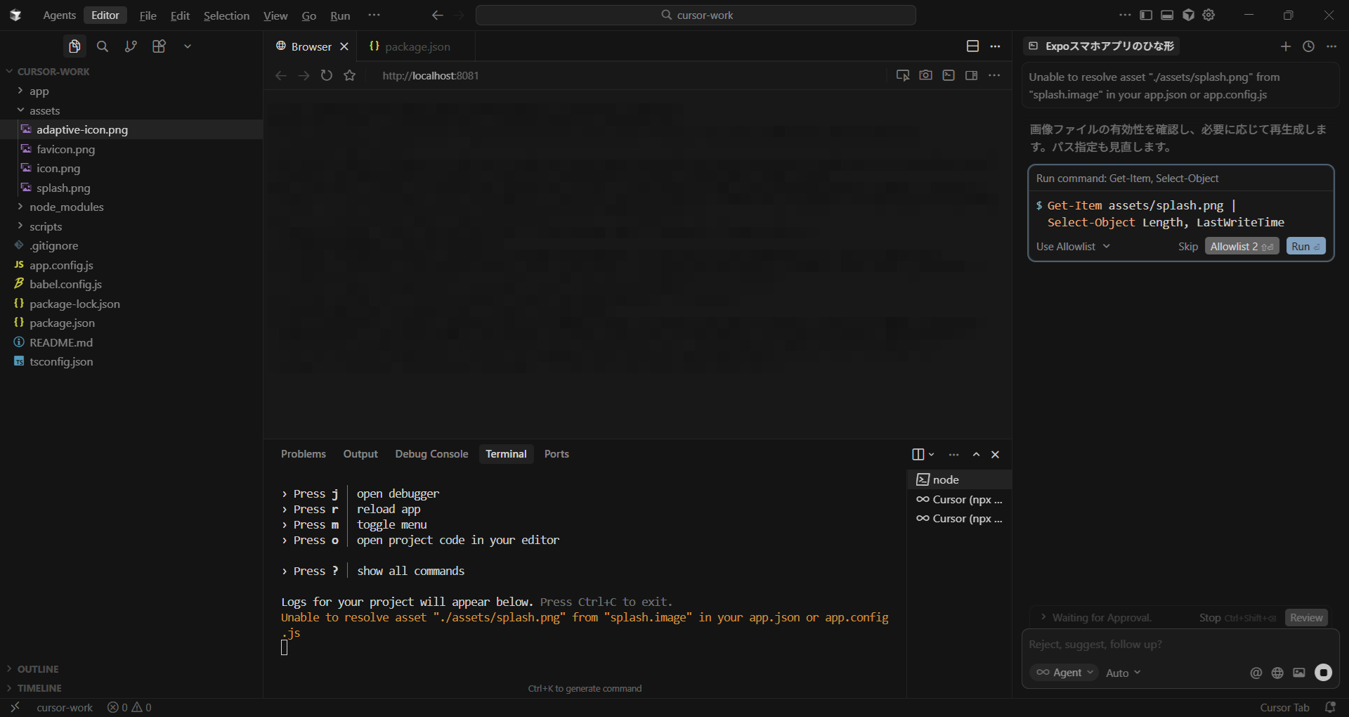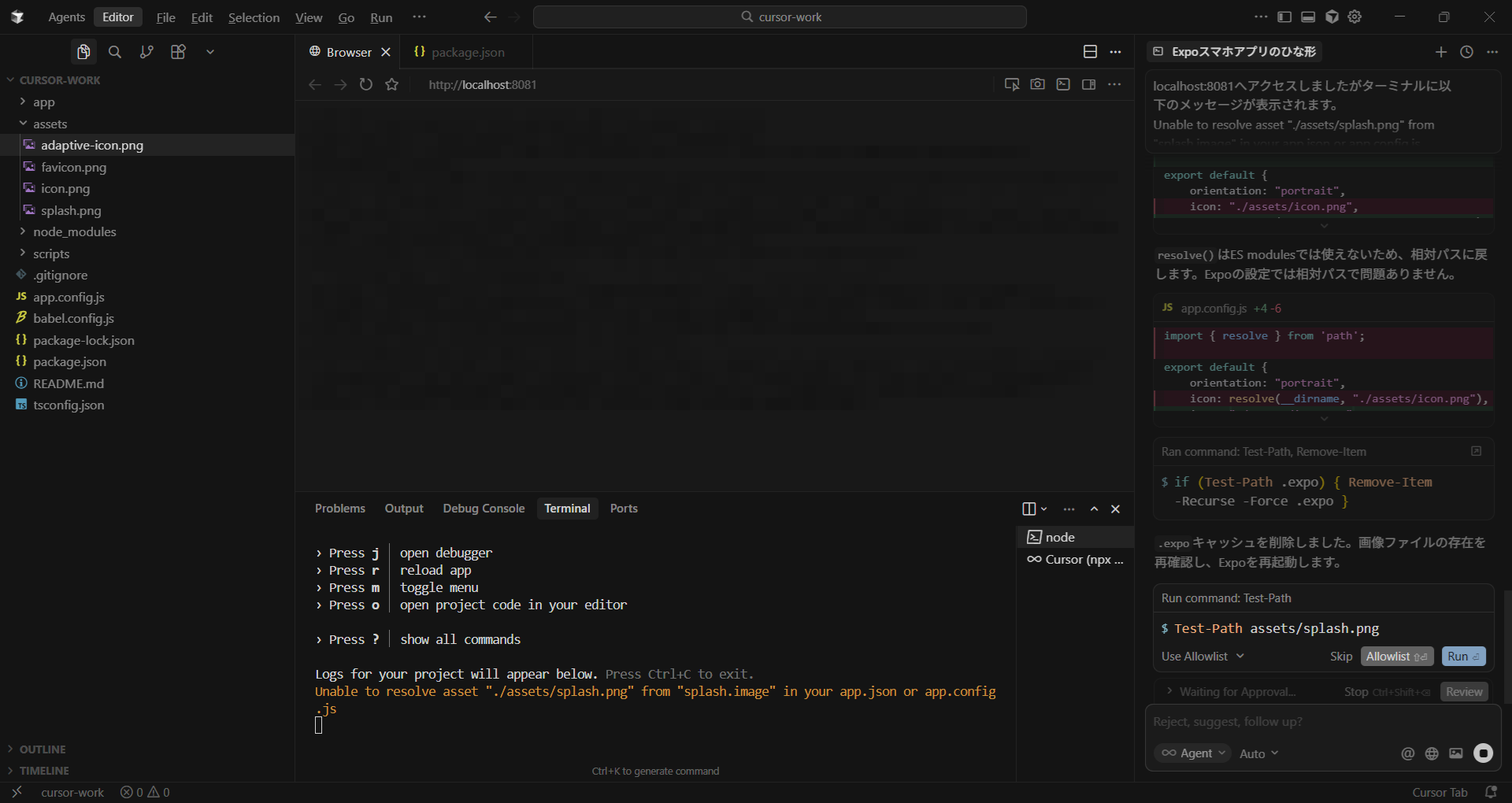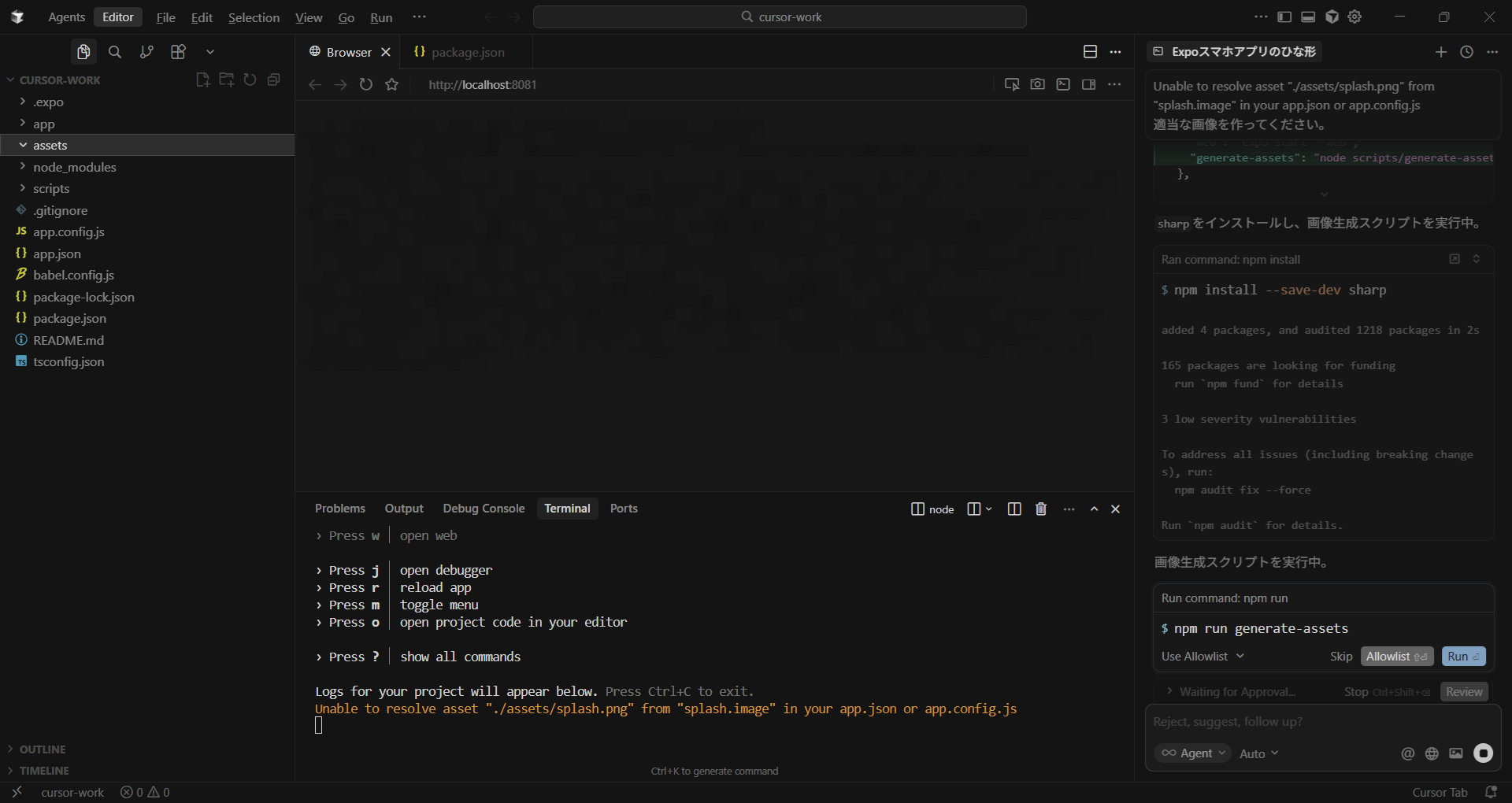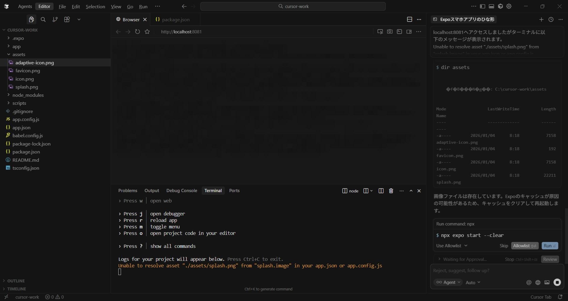 「localhost:8081へアクセスしましたがターミナルに以下のメッセージが表示されます。 Unable to resolve asset "./assets/splash.png" from "splash.image" in your app.json or app.config.js」とチャットしてみます。