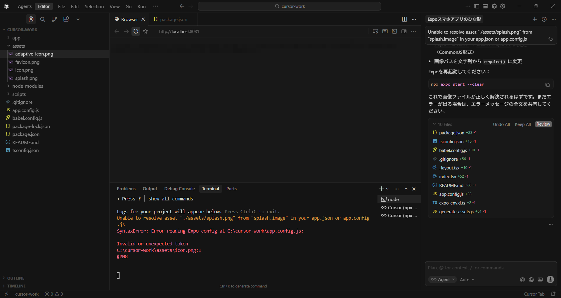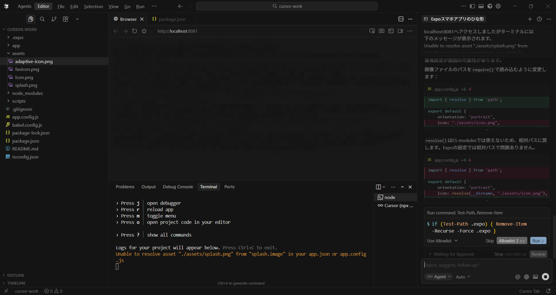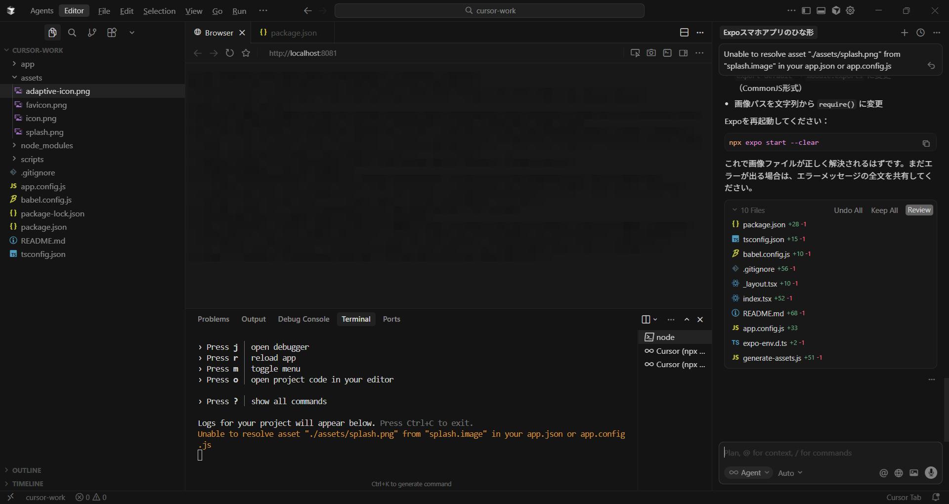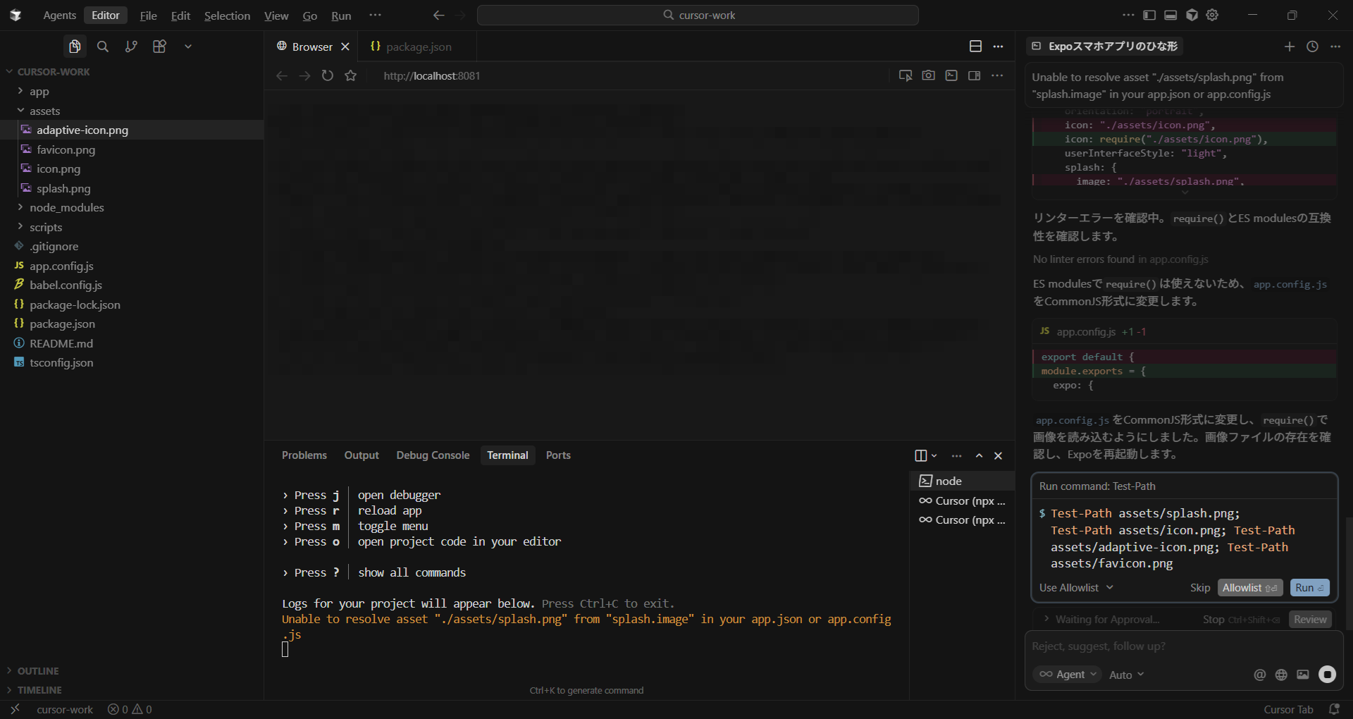 「localhost:8081へアクセスしましたがターミナルに以下のメッセージが表示されます。 Unable to resolve asset "./assets/splash.png" from "splash.image" in your app.json or app.config.js」とチャットしてみます。