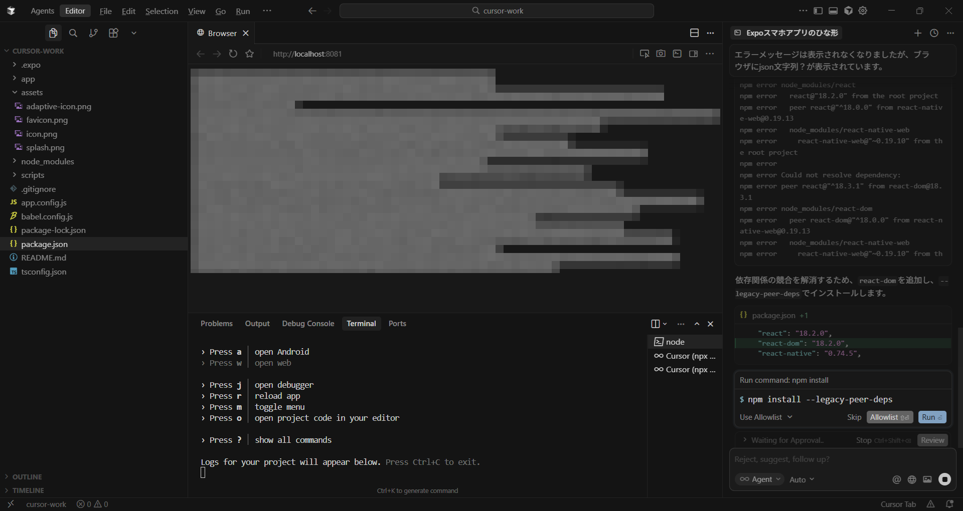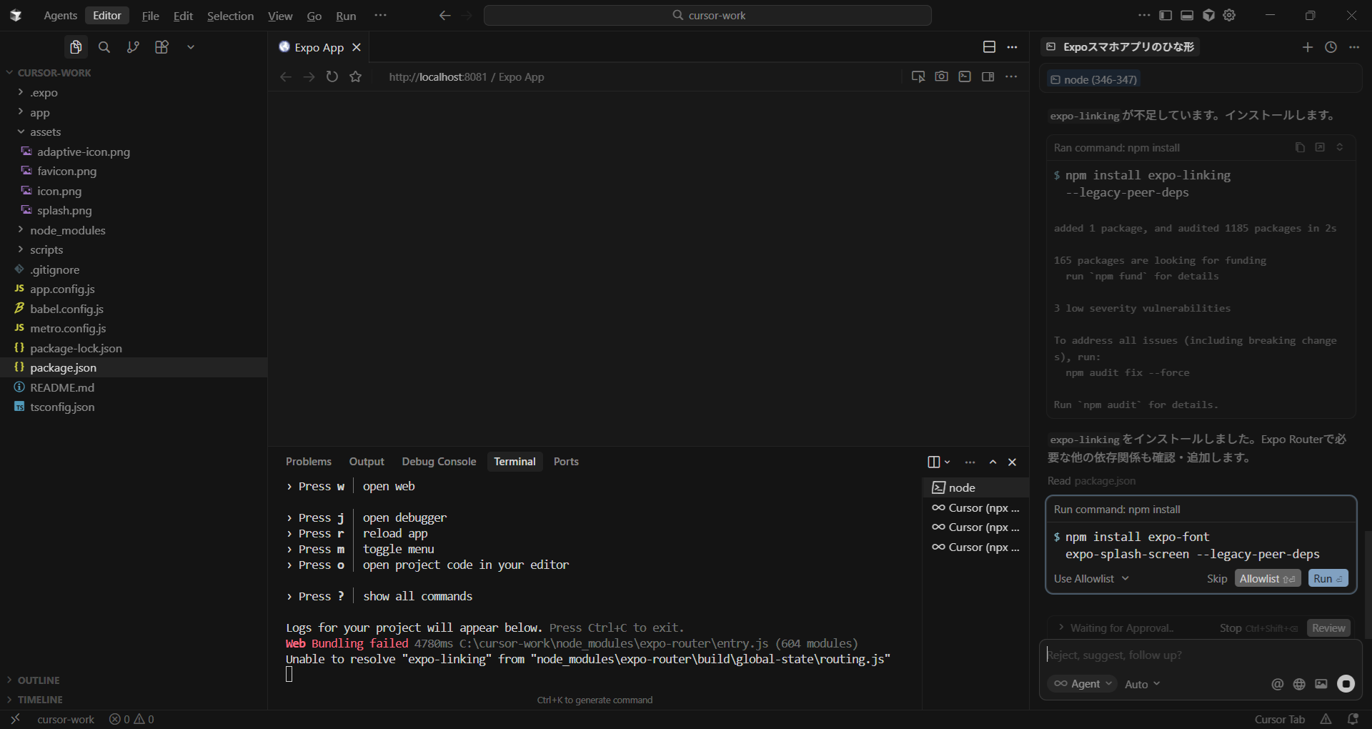 npm install expo-font expo-splash-screen --legacy-peer-depsを実行したいようです。 Runをクリックします。