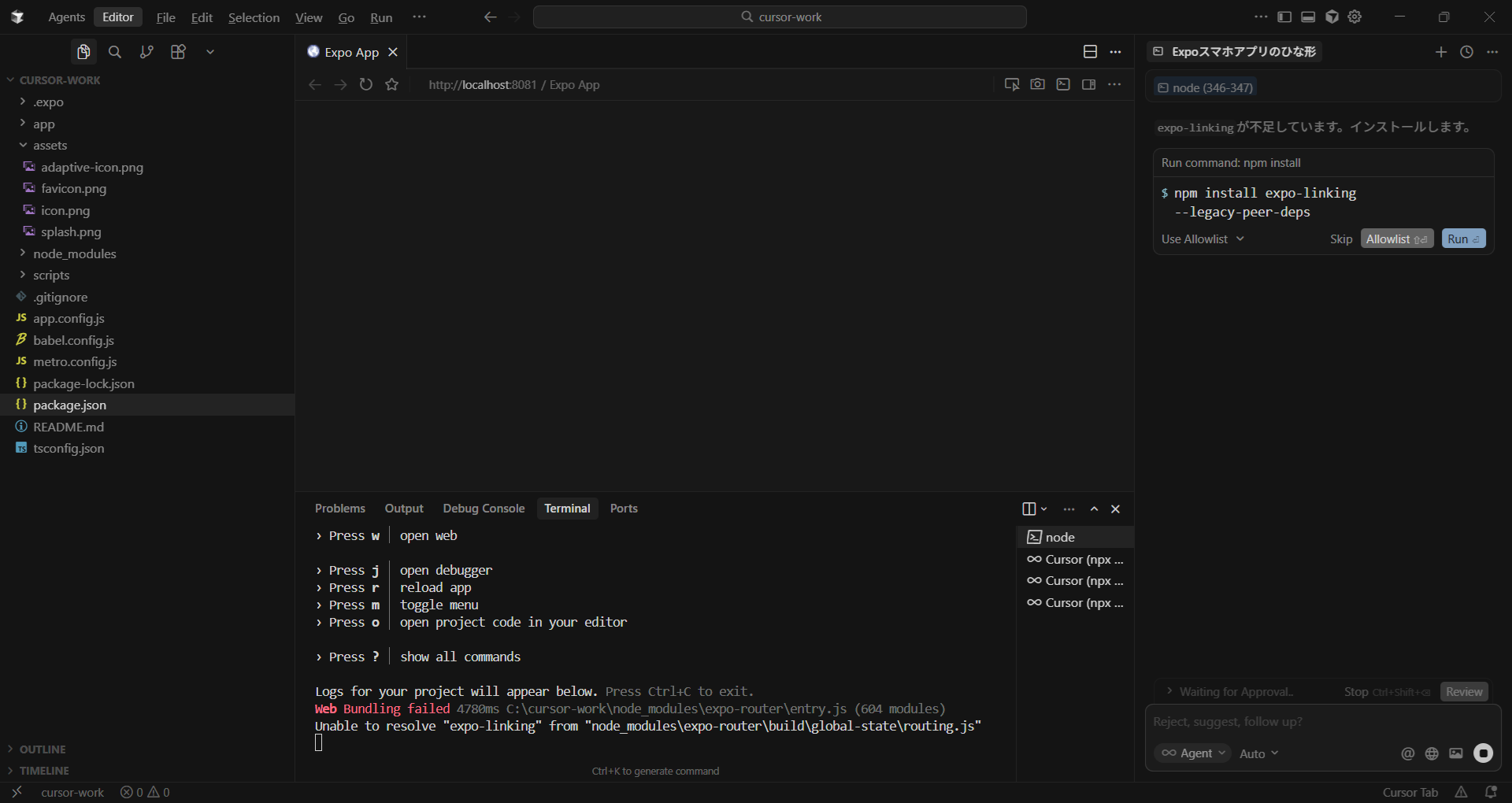 npm install expo-linking --legacy-peer-depsを実行したいようです。 Runをクリックします。