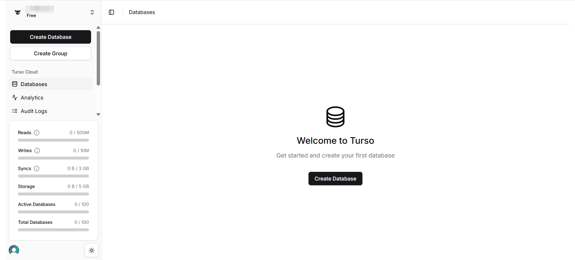 データベース名を入力しCreate Databaseをクリックするとデータベースが作成されました。