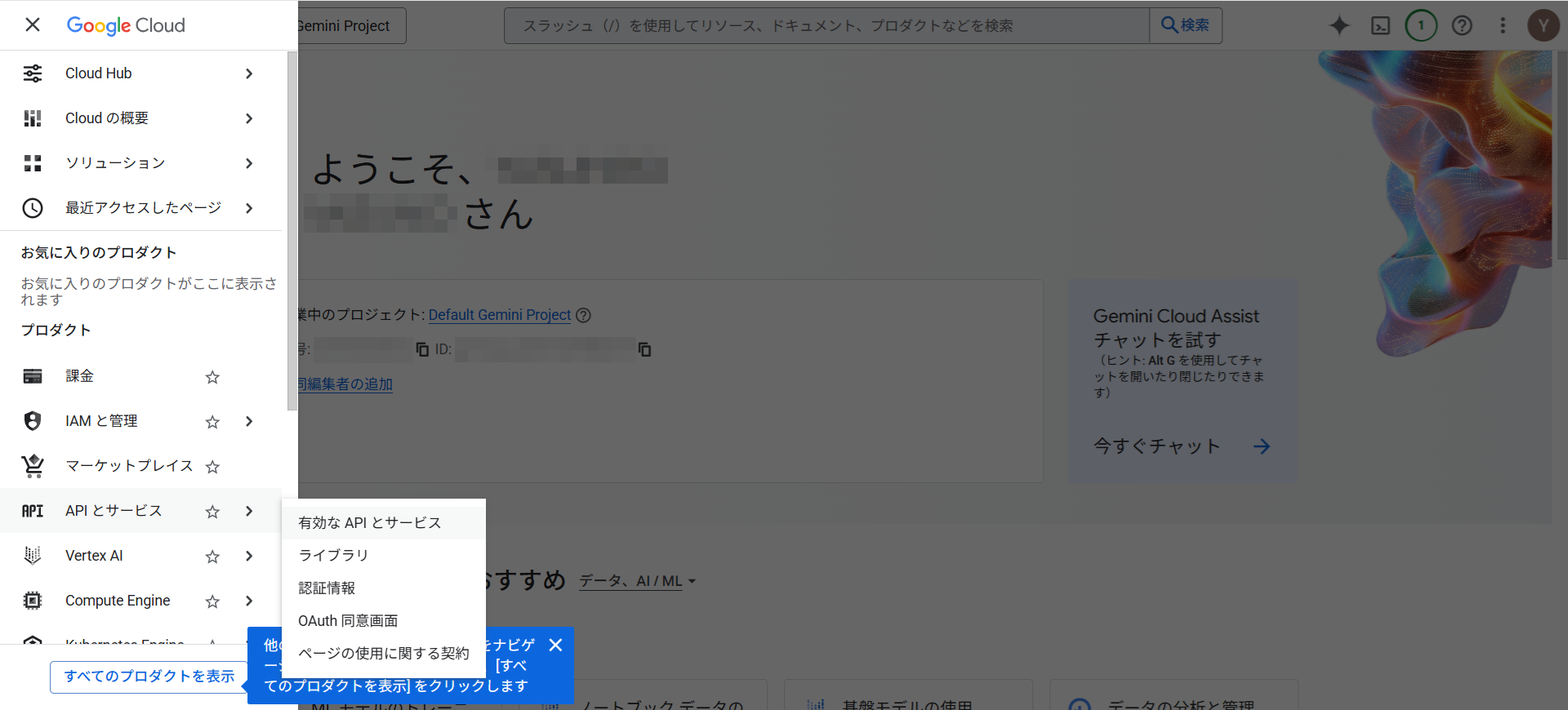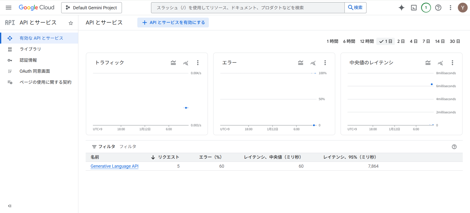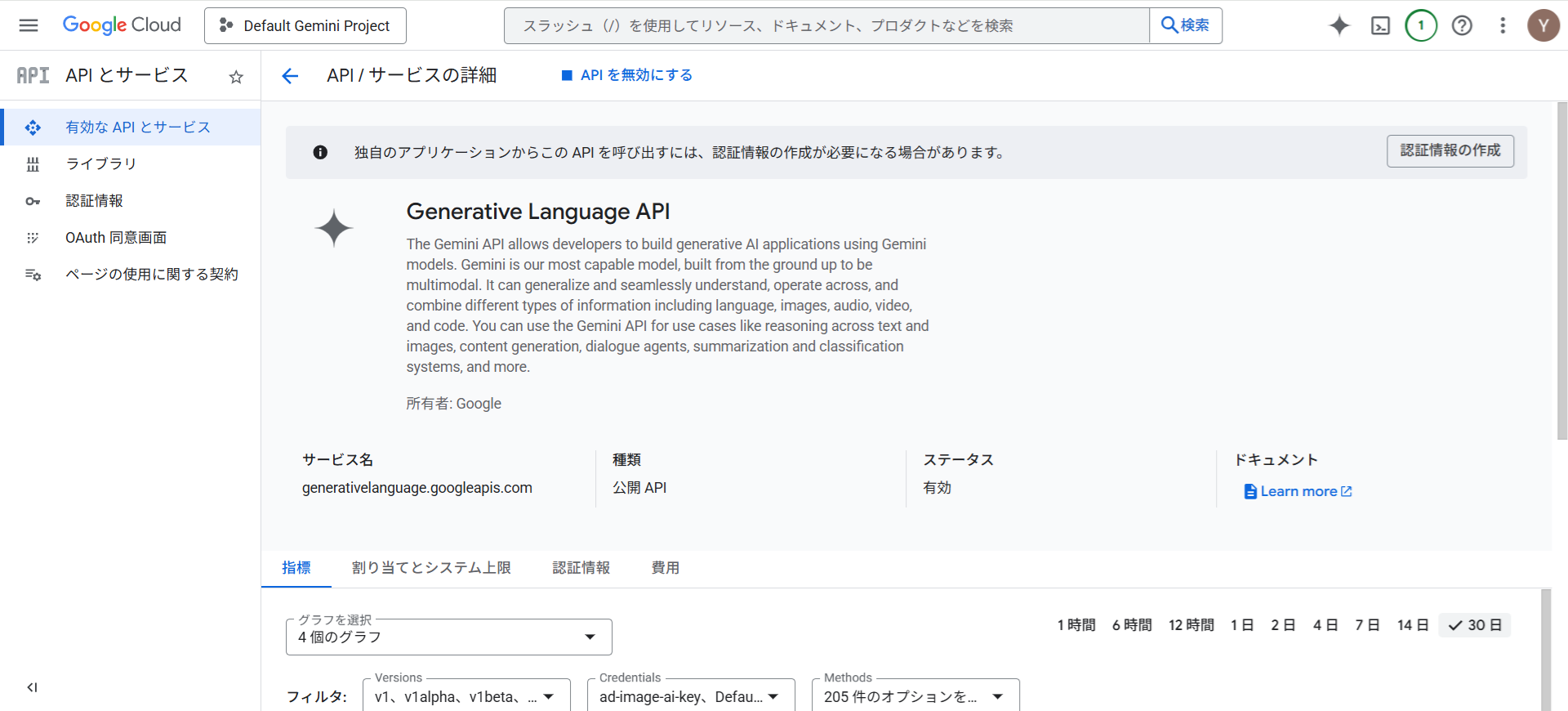 左のメニューをクリックしAPIとサービスを選択し有効なAPIとサービスをクリックします。
