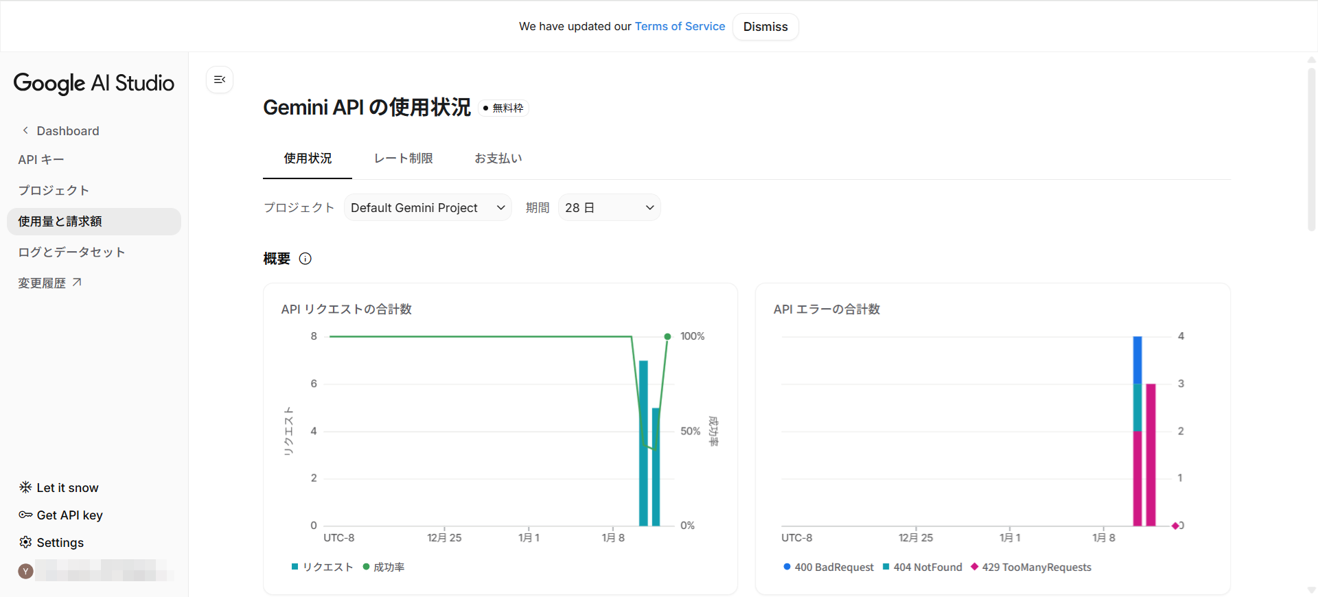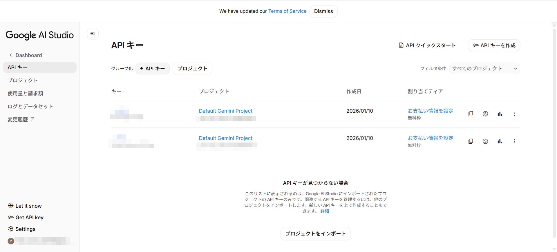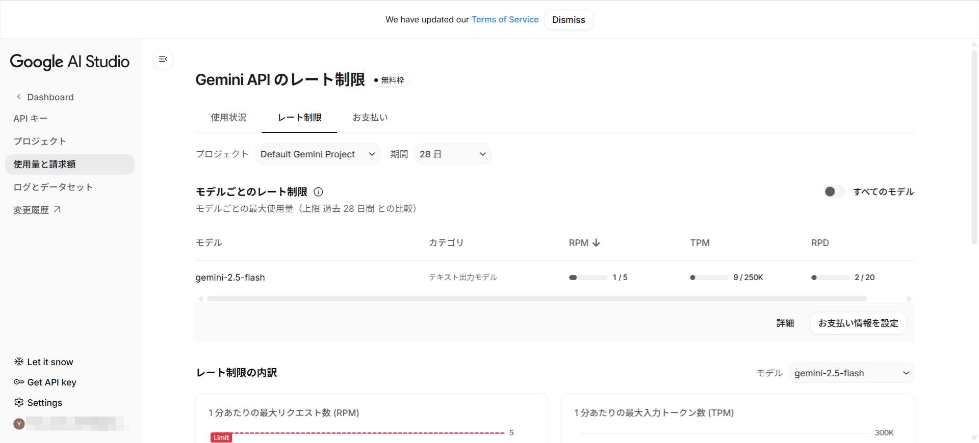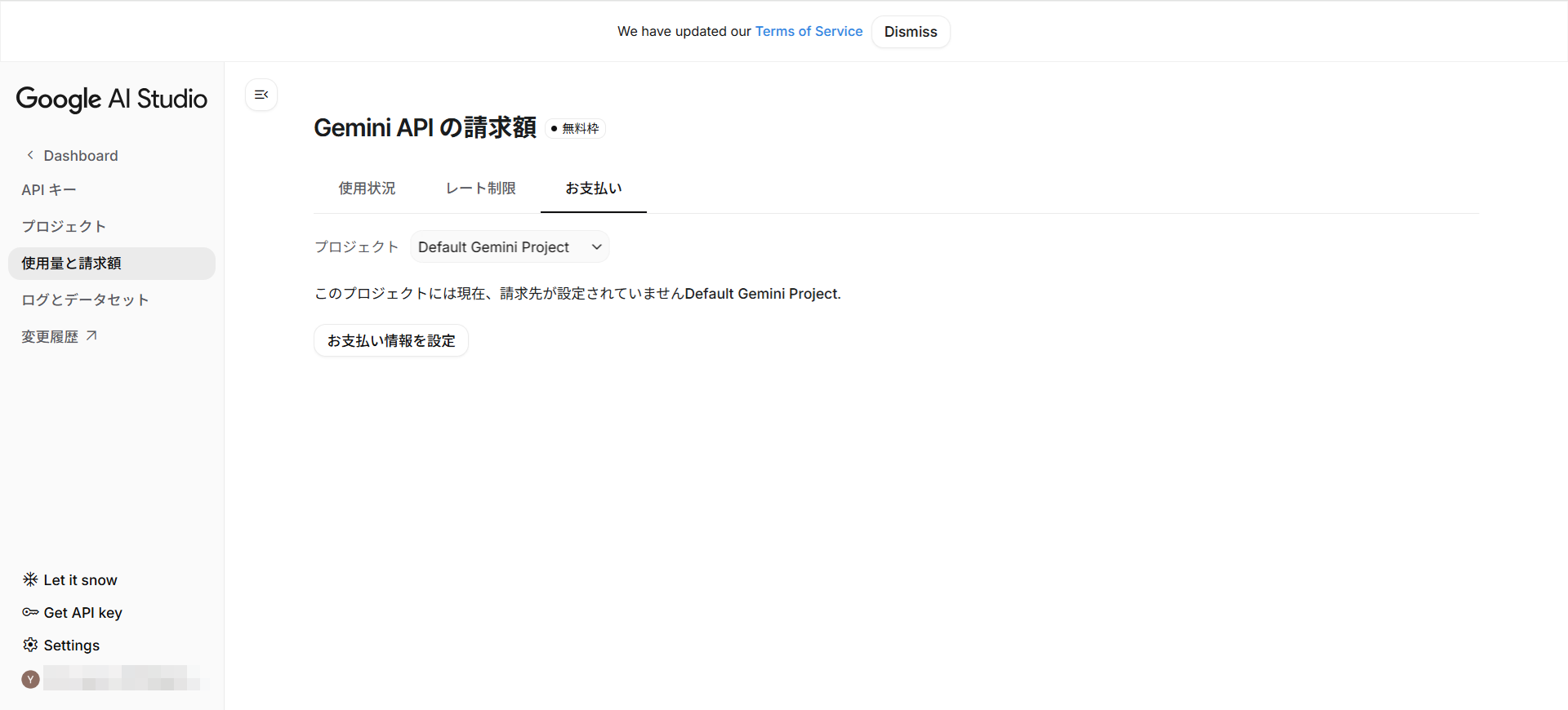 Google AI Studioを開きます。 使用量と請求額をクリックします。