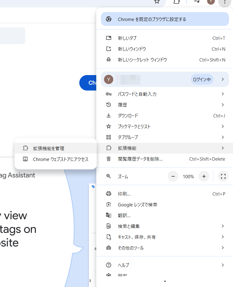 拡張機能をクリックし拡張機能を管理をクリックします。