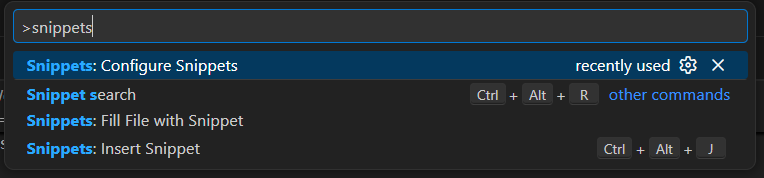 Ctrl + Shift + P を入力し snippets と入力し Confogure Snippets を選択しEnterを押します。